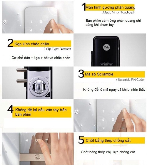 - Các cách mở khóa: thẻ từ (sẵn có 4 thẻ, đăng kí tối đa 40 thẻ ), mã số (1 mã chủ, 30 mã người dùng, mã khách). ). Có thể lắp thêm phụ kiện để mở bằng điện thoại thông minh (dùng app Yale Link) thông qua bluetooth, qua wifi hoặc với hệ thống nhà thông minh thông qua chuẩn Zigbee, Zwave
