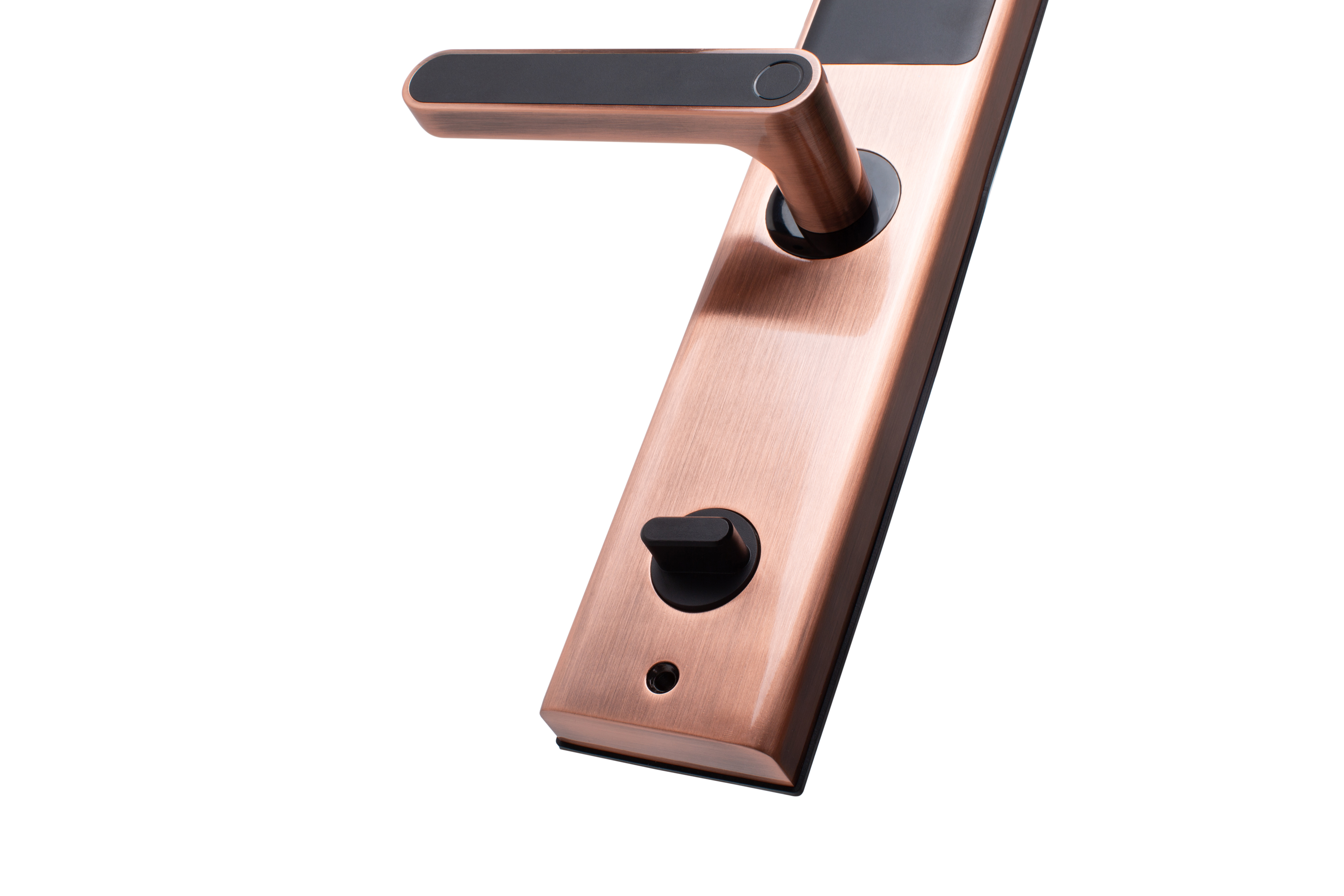 Mặt khóa bằng kính cường lực, vỏ khóa là hợp kim nhôm, tay khóa là hợp kim kẽm được sơn (mạ đồng) chất lượng cao.