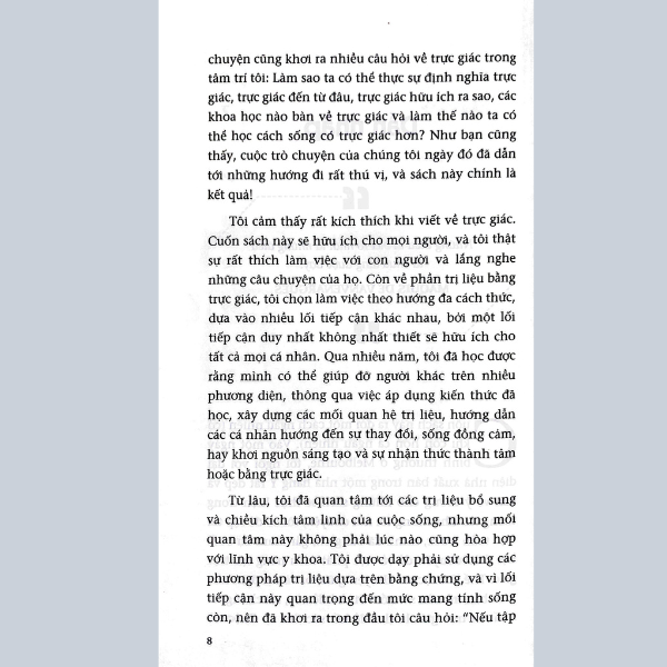 - Bác sĩ Cate Howell, Khơi Nguồn Năng Lực Trực Giác Trực giác là điều hầu hết mọi người sẽ trải nghiệm trong đời, vào lúc này hoặc lúc khác. Đó là linh cảm, là tiếng nói nội tâm hay “giác quan thứ sáu”. Nhưng liệu ta có thể chủ động phát triển trực giác và học cách ứng dụng nó tốt hơn cho cuộc sống? Bác sĩ Cate Howell tin là ai cũng có thể! Trong cuốn sách lý thú này, bác sĩ Howell khám phá trực giác là một phần của triết học, tâm lý học, tôn giáo và tâm linh từ cổ xưa cho đến hiện đại như thế nào. Bà cũng tìm hiểu về khoa học đằng sau trực giác, và cách mô tả kinh nghiệm trực giác theo chức năng não bộ. Cuối cùng, bà vạch ra chương trình bảy bước nhằm phát triển và sử dụng trực giác giúp cải thiện cuộc sống hàng ngày, để mỗi người cảm nhận được sự bình yên, niềm hạnh phúc và mục đích đời mình."