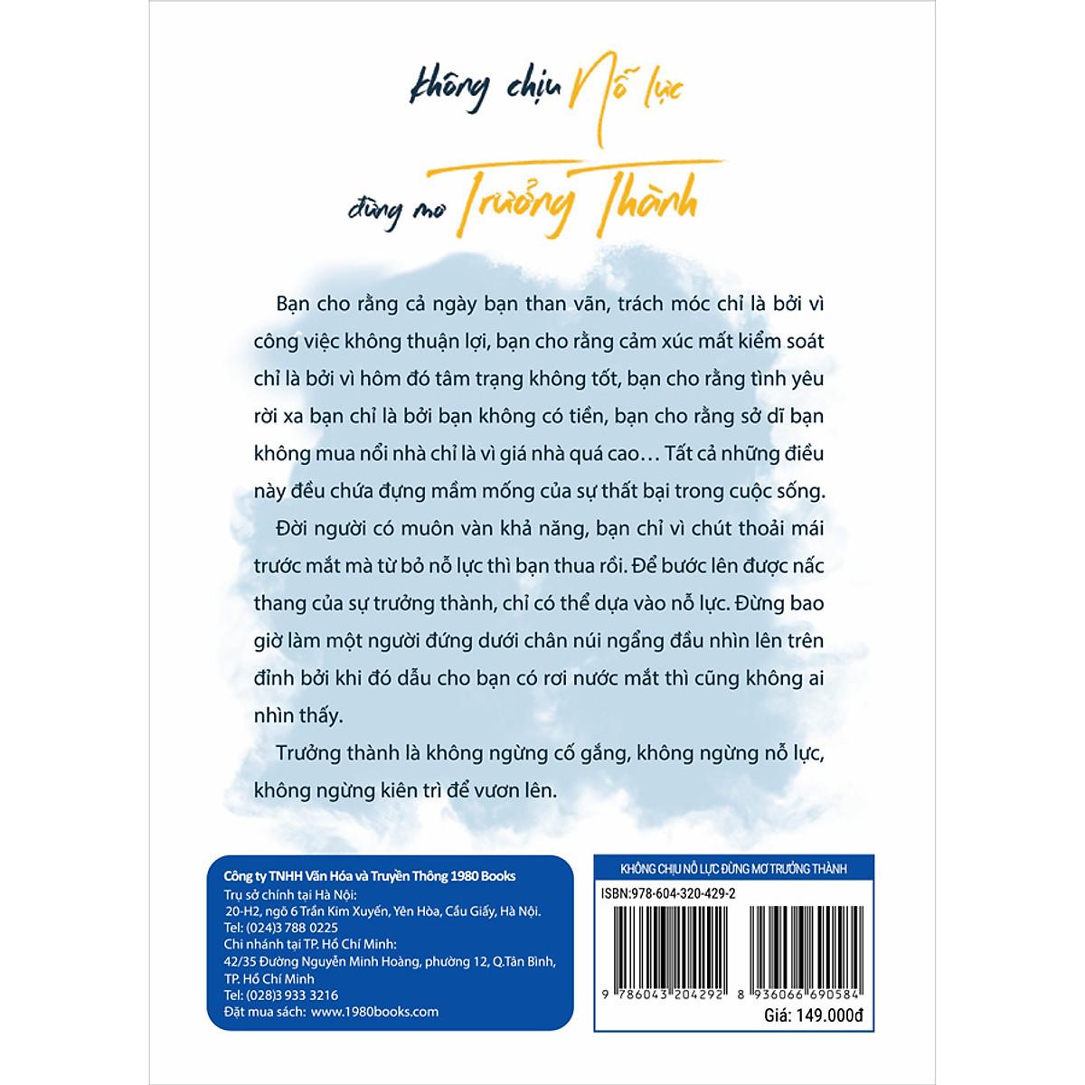 Mỗi người đều có một cái “kén” trói buộc mình, trước khi phá kén, đều sống cuộc đời giống như con sâu vậy. Cái kén này có thể là gia cảnh nghèo khó, là cuộc sống đơn điệu mỗi ngày, là những tiếng cãi lộn không điểm dừng của bố mẹ, là cuộc hôn nhân thất bại, là công việc không chút khởi sắc, là căn nhà có thể mãi mãi cũng không mua nổ Trong chiếc kén như thế này, nếu như chúng ta ngủ nướng, có thể chúng ta không hề cảm thấy khó chịu là bao, nhưng một khi chúng ta bắt đầu suy nghĩ thì sẽ lập tức cảm nhận được sự đau khổ khi bị trói buộc. Nó vây hãm chúng ta, khiến chúng ta không thể cử động, vì thế trong cuộc sống có vô số lần chúng ta rơi vào bế tắc, chỉ biết thở dài mà không biết tương lai rồi sẽ ra sao. Làm thế nào chúng ta mới có thể phá kén mà giương cánh bay cao, thật sự trải nghiệm được cảm giác tự do bay lượn giữa đất trời bao la? Không chịu nỗ lực đừng mơ trưởng thành sẽ giúp bạn giải đáp câu hỏi ấy. Chúng ta cần phải khắc phục ảnh hưởng của ngoại cảnh, khắc phục sự do dự, lười biếng, băn khoăn và lo lắng. Bất kể thế giới bên ngoài có biến hóa như thế nào, người có tinh thần tự thúc đẩy, cuối cùng đều sẽ nghe theo trái tim mình, cho dù đối mặt với tình trạng biến hóa nhanh chóng thế nào đi chăng nữa, rơi vào hoàn cảnh khó khăn như thế nào chăng nữa, cũng sẽ âm thầm chịu đựng, một mình tiến về phía trước. Đời người có muôn vàn khả năng, bạn chỉ vì chút thoải mái trước mắt mà từ bỏ nỗ lực thì bạn thua rồi. Để bước lên được nấc thang của sự trưởng thành, chỉ có thể dựa vào nỗ lực. Đừng bao giờ làm một người đứng dưới chân núi ngẩng đầu nhìn lên trên đỉnh bởi khi đó dẫu cho bạn có rơi nước mắt thì cũng không ai nhìn thấy. Trưởng thành là không ngừng cố gắng, không ngừng nỗ lực, không ngừng kiên trì để vươn lên. Thông tin tác giả: Lý Hủ Nhiên là VVIP trên diễn đàn Zhihu, có hàng triệu fan hâm mộ. Tài khoản cá nhân “Hủ tiên sinh” được Notesandbox và Newrank đánh giá là “một trong mười tài khoản Wechat đáng giá nhất” trong lĩnh vực kỹ năng nơi công sở. Sáng tác rất nhiều tác phẩm hot có danh tiếng tốt, được chia sẻ trên tường của các tài khoản lớn như Nhật báo Nhân dân, Youshu, Duzhe, Master I