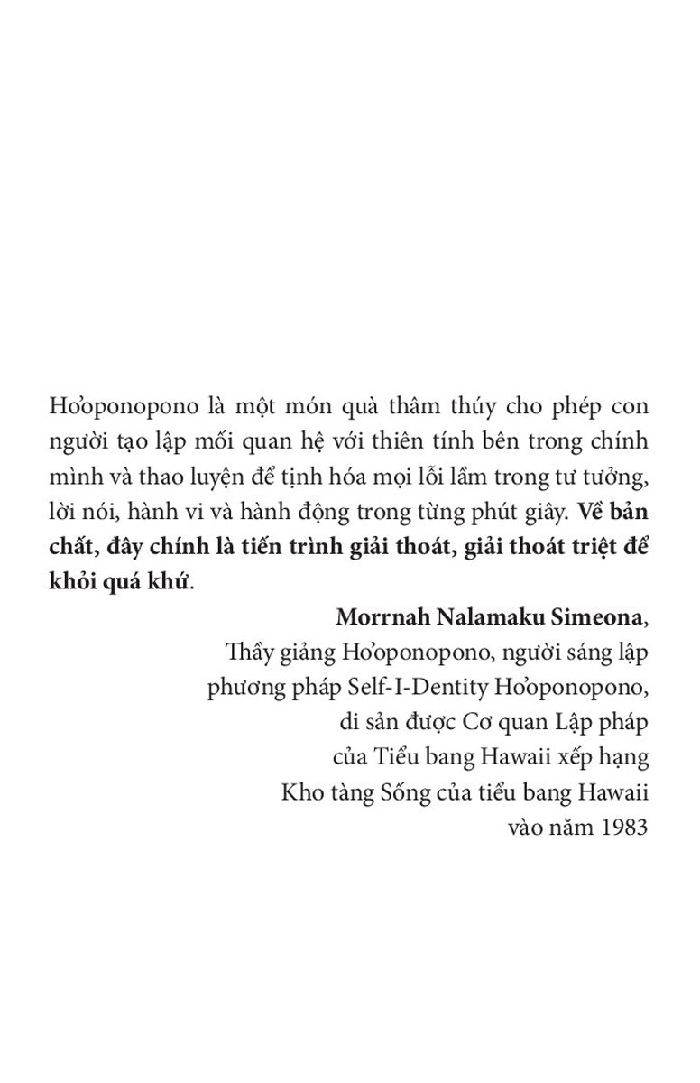 Ho'oponopono là một hệ thống bí quyết tâm linh cổ xưa của người Hawaii, một phương pháp trị liệu vô cùng hiệu quả để giải phóng tâm thức, loại bỏ những trở ngại tinh thần, giúp bạn đạt đến mục tiêu không giới hạn trong công việc lẫn cuộc sống.