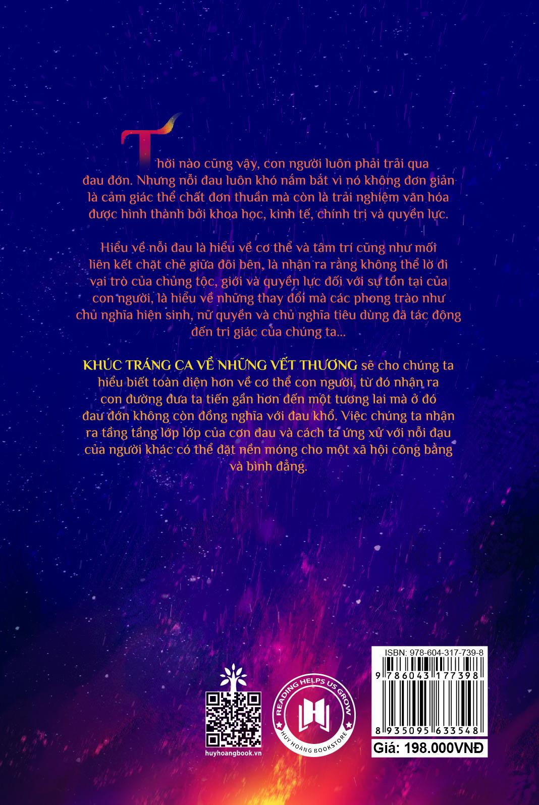 Khúc Tráng Ca Về Những Vết Thương Cuốn sách cho người đọc hiểu biết toàn diện về cơ thể con người, về ảnh hưởng của những cơn đau đến cuộc sống của chúng ta, cách ta nhìn nhận ý nghĩa và chế ngự nó trong suốt chiều dài lịch sử. Từ đó, chúng ta nắm bắt được bản chất của nỗi đau, cũng như mối liên kết chặt chẽ giữa cơ thể và tâm trí, và nhận ra rằng không thể lờ đi vai trò của c.hủng tộc, giới và quyền lực đối với sự tồn tại của con người.