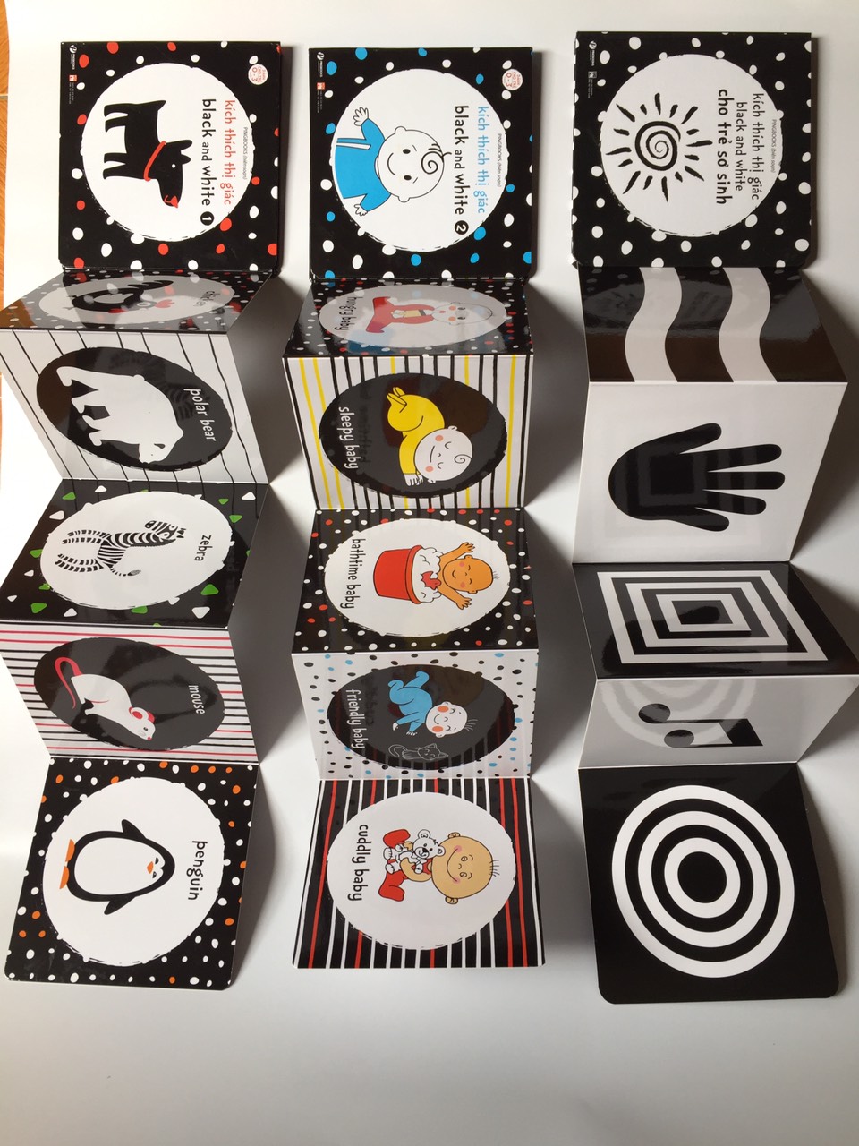 Đôi mắt là cửa sổ tâm hồn! Làm cha mẹ, ai cũng mong con mình có đôi mắt khỏe, thị lực tốt để tiếp nhận thế giới bên ngoài. Trẻ ngay khi vừa chào đời, thị giác là giác quan có thể coi là hoạt động sớm và mạnh mẽ nhất, bé đã biết dùng mắt để phản ứng với môi trường xung quanh. Đây cũng chính là giai đoạn vàng vì bé có năng lực tiếp thu lớn nhất, vì vậy cha mẹ không nên bỏ lỡ giai đoạn này trở đi.Theo tiến sĩ Amanda Gummer, một nhà tâm lý học chuyên nghiên cứu về sự phát triển của trẻ chỉ ra rằng: “ Khi trẻ sơ sinh được cho xem/ nhìn những hình ảnh có độ tương phản cao sẽ tác động trực tiếp đến sự phát triển thị giác. Việc kích thích phát triển thị giác từ khi sinh ra không chỉ giúp phát triển thị lực mà còn giúp não bộ phát triển toàn diện”. Pingbooks xin gửi tới quý nhà sách và các bậc phụ huynh tựa sách KÍCH THÍCH THỊ GIÁC BLACK AND WHITE – sách giúp hỗ trợ phát triển thị giác cho bé từ 0-3 tuổi. Bộ sách KÍCH THÍCH THỊ GIÁC BLACK AND WHITE sẽ giúp tăng khả năng quan sát của trẻ, rèn luyện và phát triển thị giác. Kích thích phát triển trí não của con… Là bộ sách zigzag gồm 2 cuốn với nội dung 100% là tiếng Anh do Pingbooks biên soạn với các chủ đề về con người, loài vật, phương tiện giao thông, thiên nhiên… Bộ sách có màu sắc độ tương phản cao, chủ đạo là trắng và đen, hình ảnh sáng rõ thu hút sự tập trung, giúp bé nhận diện rõ nét hình dạng và đồng thời kích thích thị giác cho bé. Thuộc dòng board-book bìa cứng với các trang sách vô cùng chắc chắn, dày dặn, có cán bóng, các góc sách cũng được bo tròn, nên các bé có thể thoải mái chơi với sách. Sách có thể để xung quanh giường, cũi, nôi để bé không bị nhàm chán với không gian xung quanh mình. Bộ sách thích hợp với các bé từ sơ sinh đến 3 tuổi
