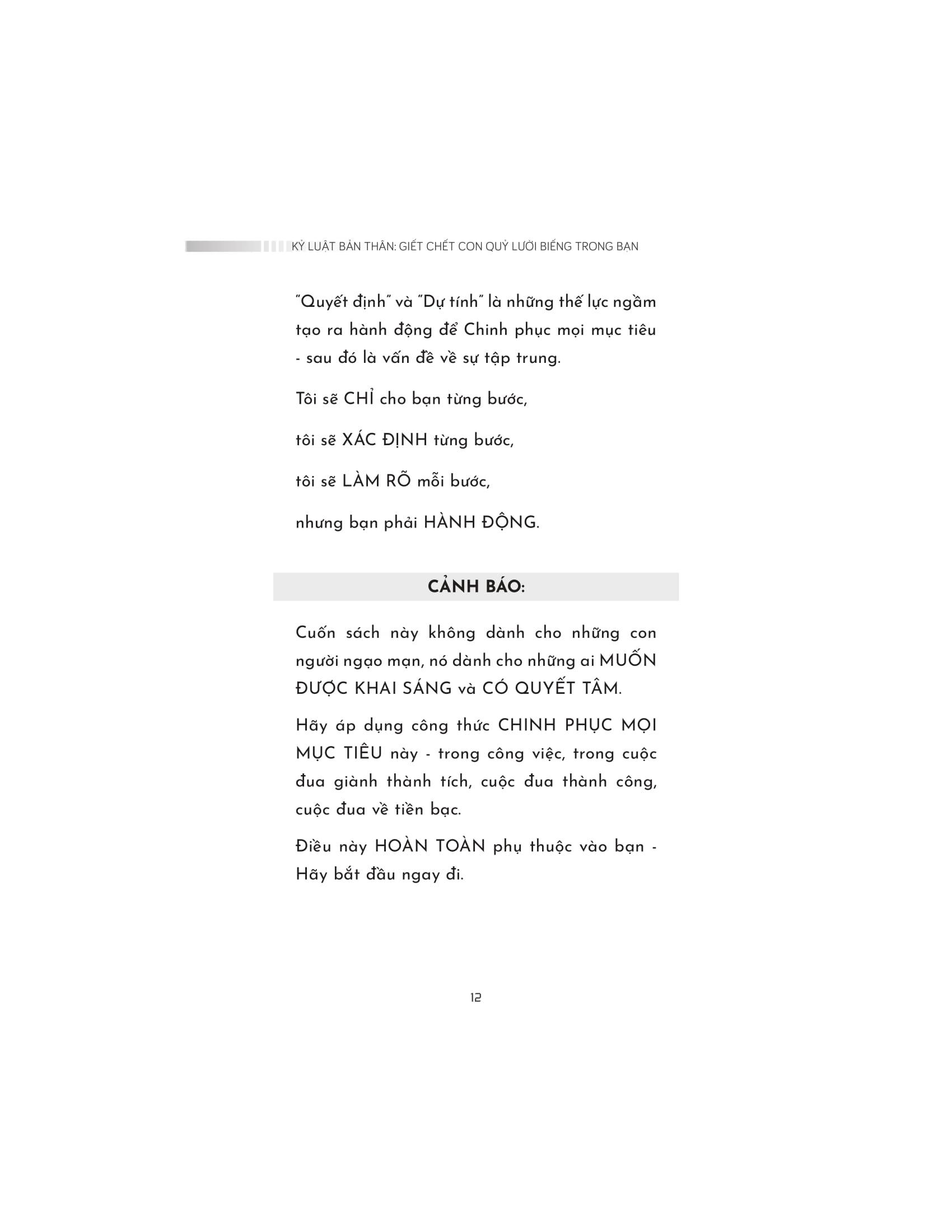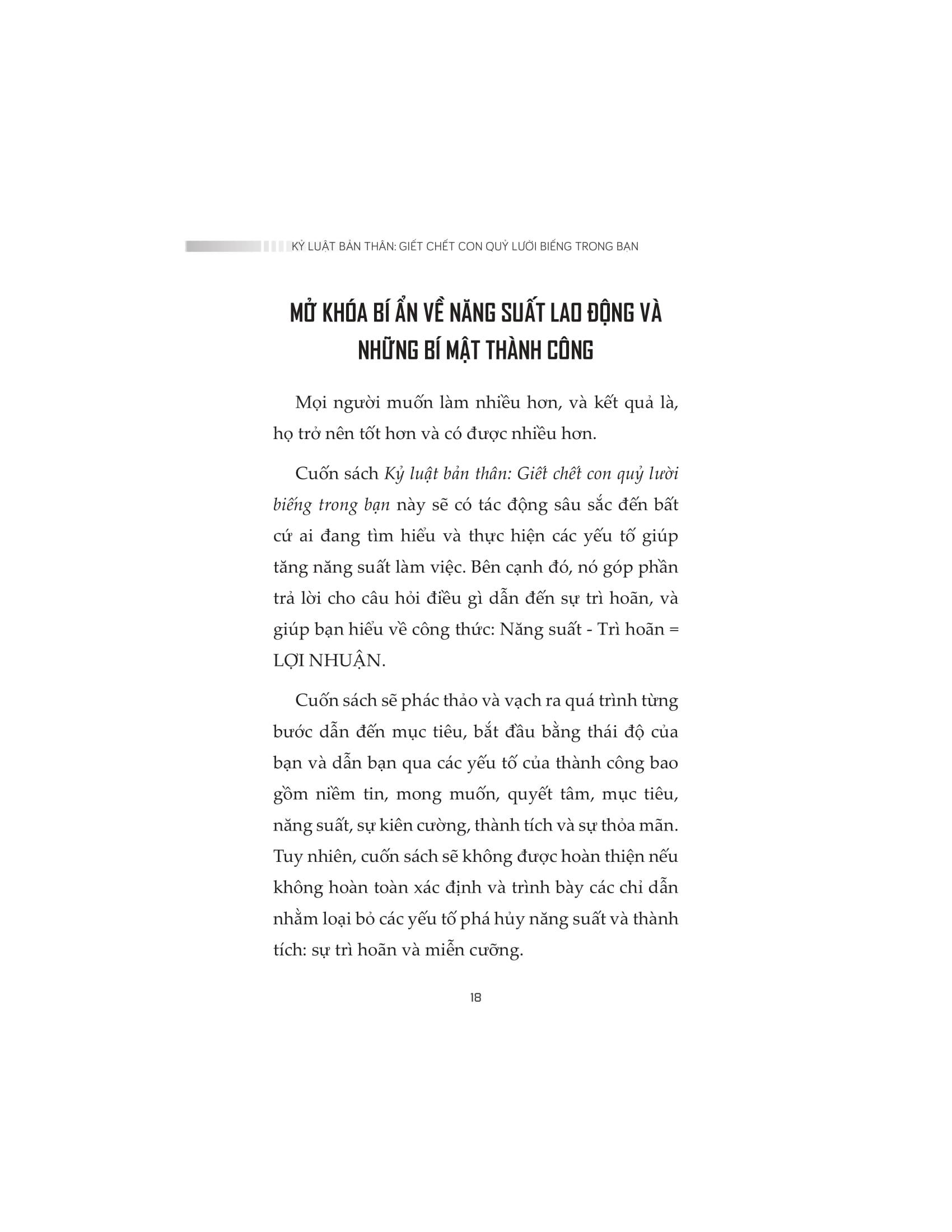 Bạn có muốn làm được nhiều việc hơn, hoàn thành được nhiều mục tiêu hơn, gặt hái được nhiều thành tựu hơn nữa? Tất nhiên câu trả lời là “Có”, tất cả mọi người đều muốn vậy. Nhưng điều gì đang ngăn cản bạn? Có rất nhiều lý do, nhưng thói quen trì hoãn, sự thiếu kỷ luật và các yếu tố gây sao nhãng trong thế giới hiện đại chính là những nguyên nhân hàng đầu. Kỷ luật bản thân: Giết chết con quỷ lười biếng trong bạn không chỉ cho bạn thấy những điều gì đang ngăn cản bạn đạt được kết quả mong muốn, mà còn cung cấp các công cụ và chiến lược để giúp bạn hoàn thành được các mục tiêu một cách tập trung, quyết liệt và hiệu quả cao.