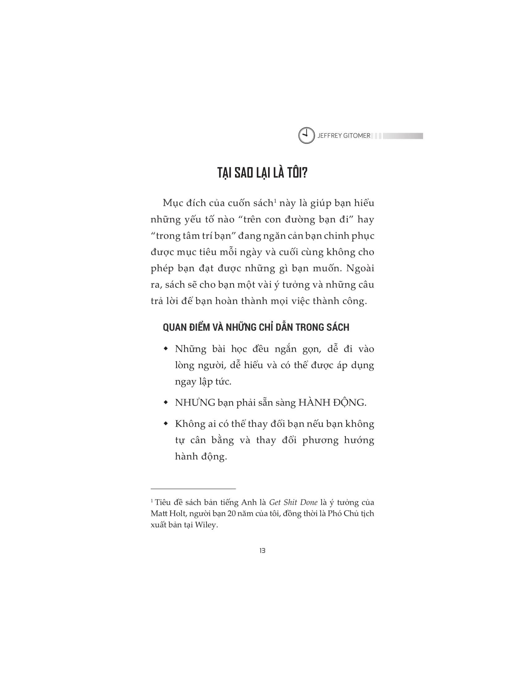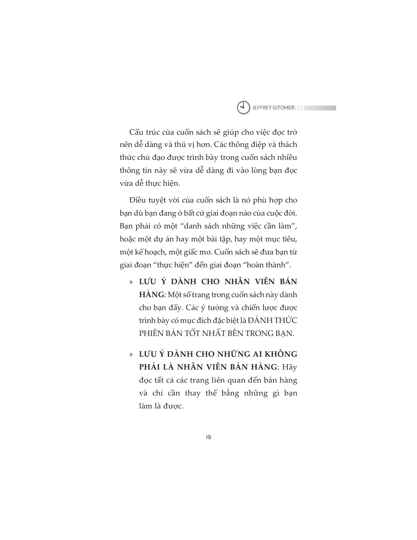 Cuốn sách cung cấp cho bạn kế hoạch toàn diện, từng bước để đạt được năng suất tối đa. Tác giả của những cuốn sách bán chạy nhất Jeffrey Gitomer sẽ hướng dẫn bạn từng khía cạnh của quy trình loại bỏ trì hoãn, từ thái độ, khao khát và quyết tâm đến nghệ thuật kiên trì và làm tới cùng. Dễ đọc và lôi cuốn, cuốn sách chỉ cho bạn những cách tốt nhất để đầu tư thời gian vào những hành động giá trị và mang lại lợi nhuận. Khi vượt qua được tâm lý lười biếng để hành động ngay lập tức, bạn sẽ có thể: