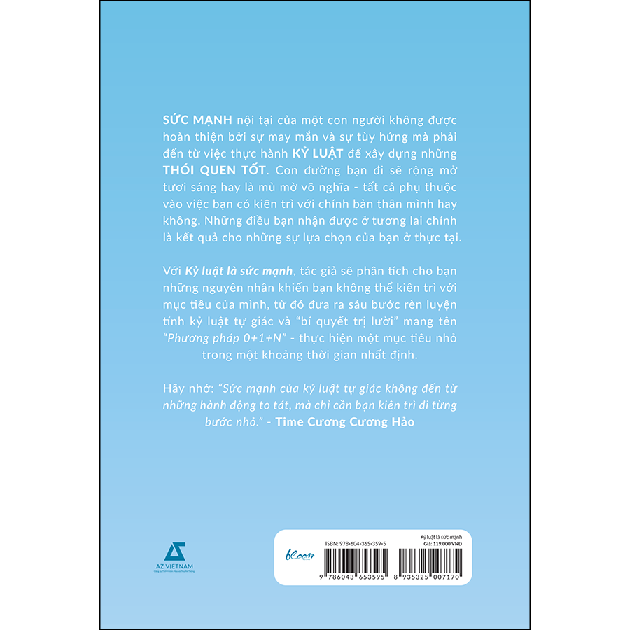 Với cuốn sách Kỷ luật là sức mạnh, tác giả sẽ phân tích cho bạn những nguyên nhân khiến bạn không thể kiên trì với mục tiêu của mình, từ đó đưa ra sáu bước rèn luyện tính kỷ luật tự giác và “bí quyết trị lười” mang tên “Phương pháp 0+1+N” - thực hiện một mục tiêu nhỏ trong một khoảng thời gian nhất định.