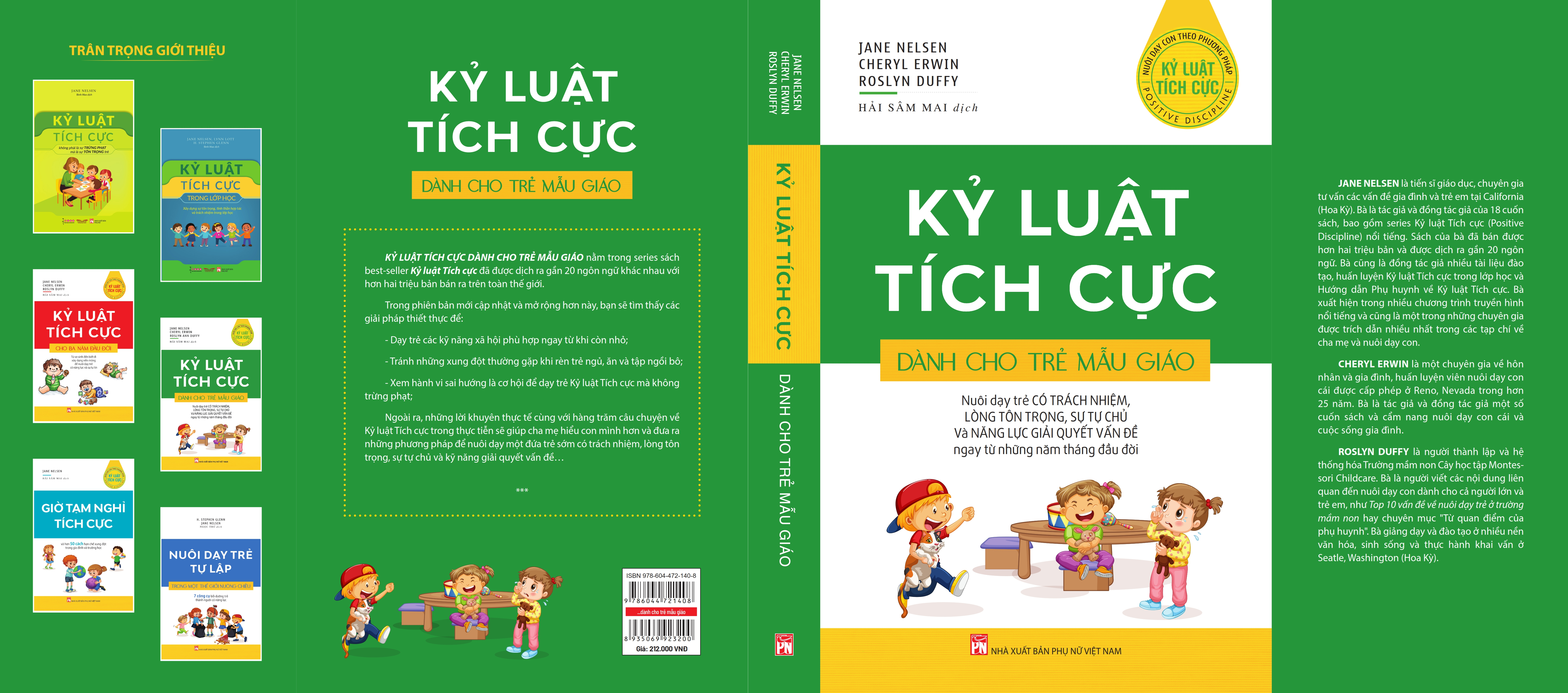 Kỷ luật tích cực dành cho trẻ mẫu giáo nuôi dạy trẻ CÓ TRÁCH NHIỆM, LÒNG TÔN TRỌNG, SỰ TỰ CHỦ và NĂNG LỰC GIẢI QUYẾT VẤN ĐỀ ngay từ những năm tháng đầu đời Thể loại: nghiên cứu;  Số trang: 500; Khổ: 15,5x23,5cm Tác giả: Tiến sĩ Jane Nelsen, Cheryl Erwin và Roslyn Duffy Người dịch: Hải Sâm Mai Giá bìa: 212.000đ Nhà xuất bản Phụ nữ Việt Nam  phát hành trên toàn quốc tháng 11 năm 2023. Tác phẩm BOX: KỶ LUẬT TÍCH CỰC LÀ GÌ?Hầu hết mọi người đều nghĩ kỷ luật đồng nghĩa với trừng phạt.Thực tế không phải vậy. Từ “kỷ luật” (discipline) xuất phát từ từ gốc Latin disciplina có nghĩa là “giảng dạy, đào tạo, giáo dục” và từ discipulus có nghĩa là “đồ đệ hoặc học trò”. Và Kỷ luật tích cực (Positive Discipline) là sự dạy dỗ và học hỏi - không phải sự trừng phạt. Áp dụng những phương pháp Kỷ luật tích cực trong gia đình, trong nhà trường và trong lớp học có nghĩa là tất cả các phụ huynh, giáo viên và học sinh cùng đồng lòng tham gia xây dựng một cộng đồng để cao sự tôn trọng lẫn nhau, xây dựng sự tự tôn và tinh thần trách nhiệm đồng thời nuôi dưỡng tài năng học thuật của các em. Nhưng Kỷ luật Tích cực cũng không có nghĩa là xóa bỏ hết các cách xử lý đối với những hành vi nguy hiểm và nghiêm trọng. Những cách xử lý đó rất quan trọng trong xã hội dân sự.Nói đúng hơn, sự đồng thuận đó có nghĩa là chúng ta sẽ xem lại toàn bộ mọi chuyện trước khi để hành động gây hậu quả nghiêm trọng xảy ra. Nó cũng đồng nghĩa với việc chúng ta sẽ áp dụng cách giải quyết như thế nào đối với các hành vi nghiêm trọng và nguy hiểm, và những kết quả theo sau của các cách giải quyết đó, để trẻ hình thành được sự kết nối bền chặt hơn với cộng đồng của mình, thay vì bị cô lập và đẩy ra xa. Kỷ luật Tích cực dành cho trẻ mẫu giáo - nuôi dạy trẻ CÓ TRÁCH NHIỆM, LÒNG TÔN TRỌNG,  SỰ TỰ CHỦ và NĂNG LỰC GIẢI QUYẾT VẤN ĐỀ ngay từ những năm tháng đầu đời