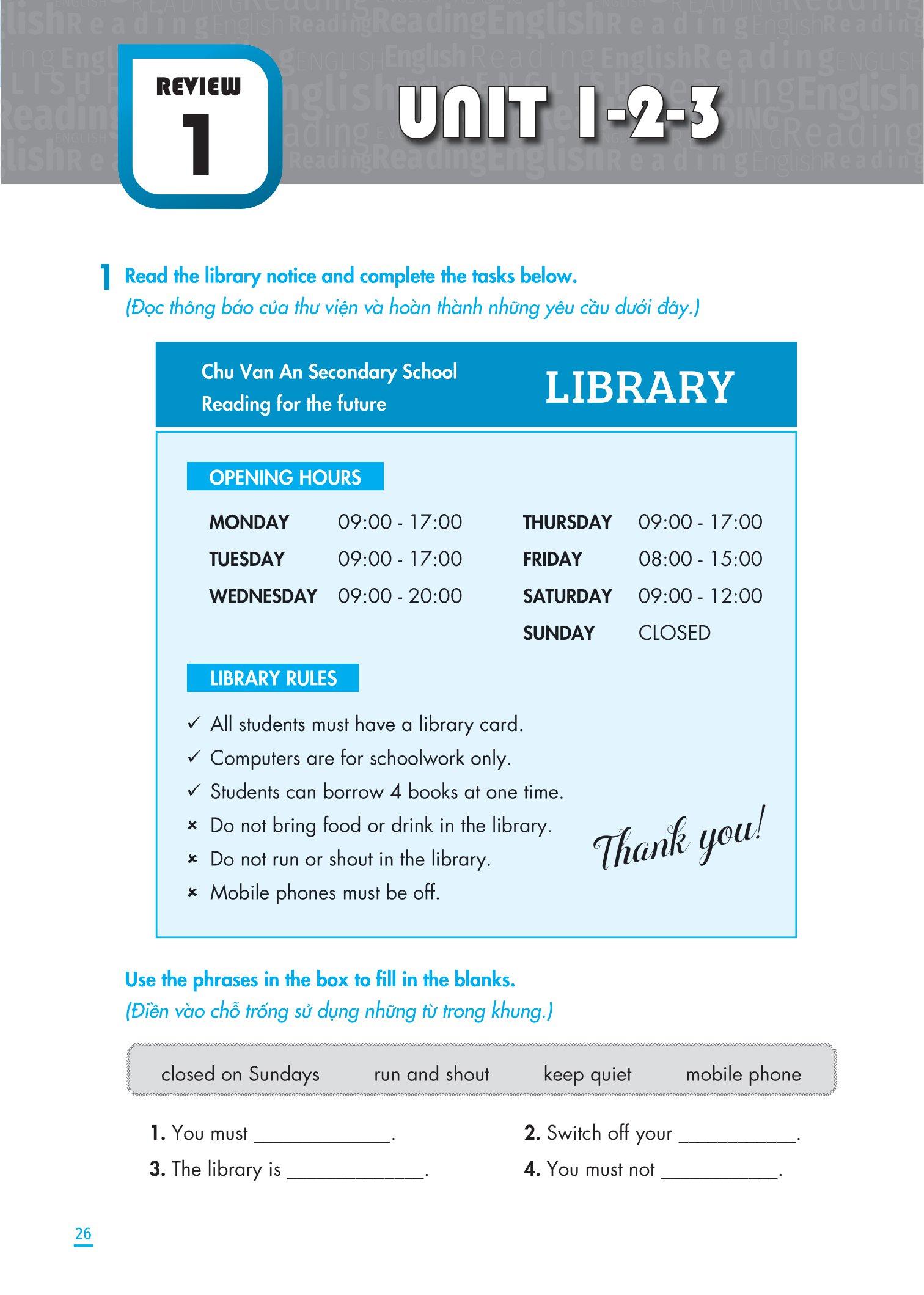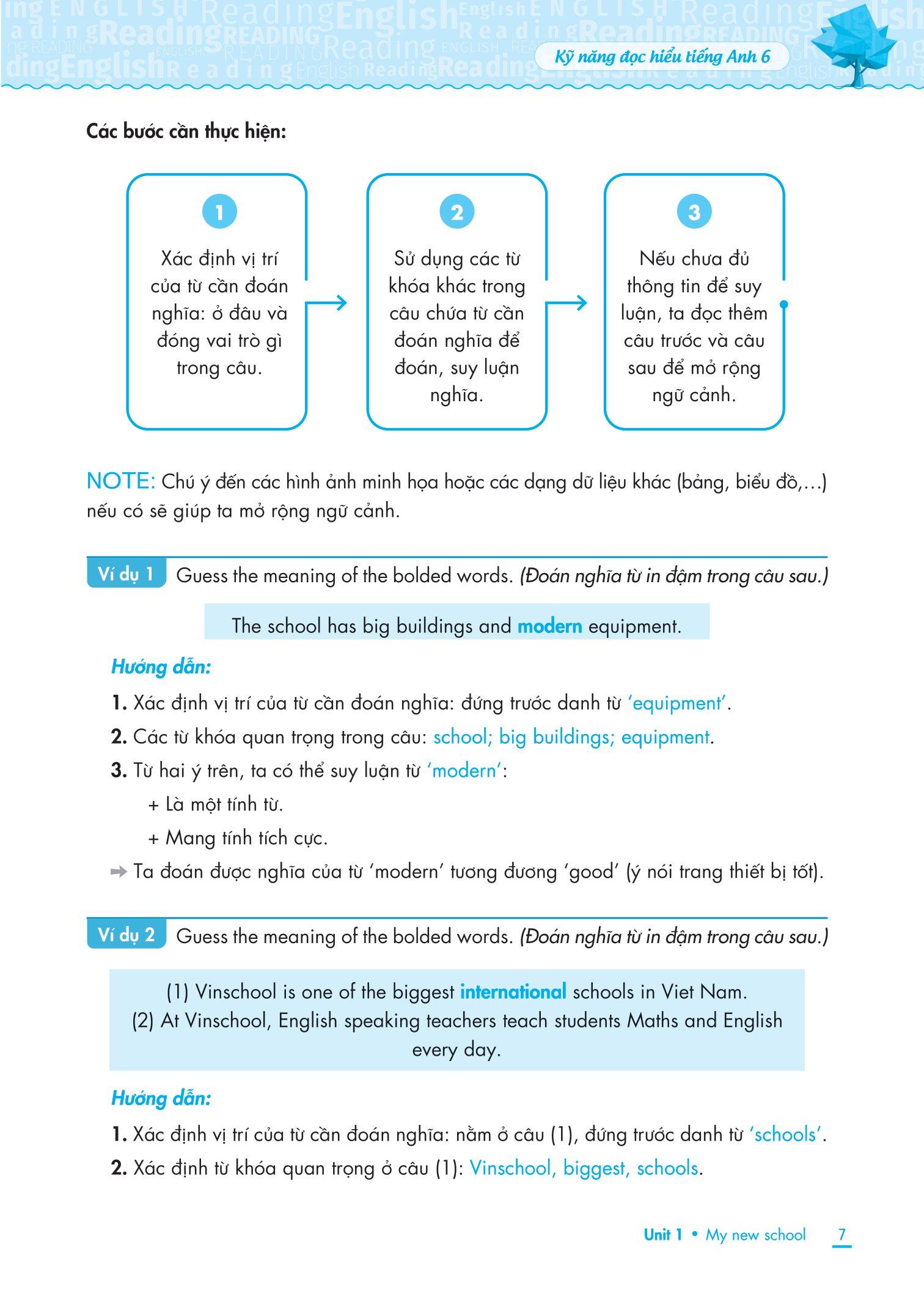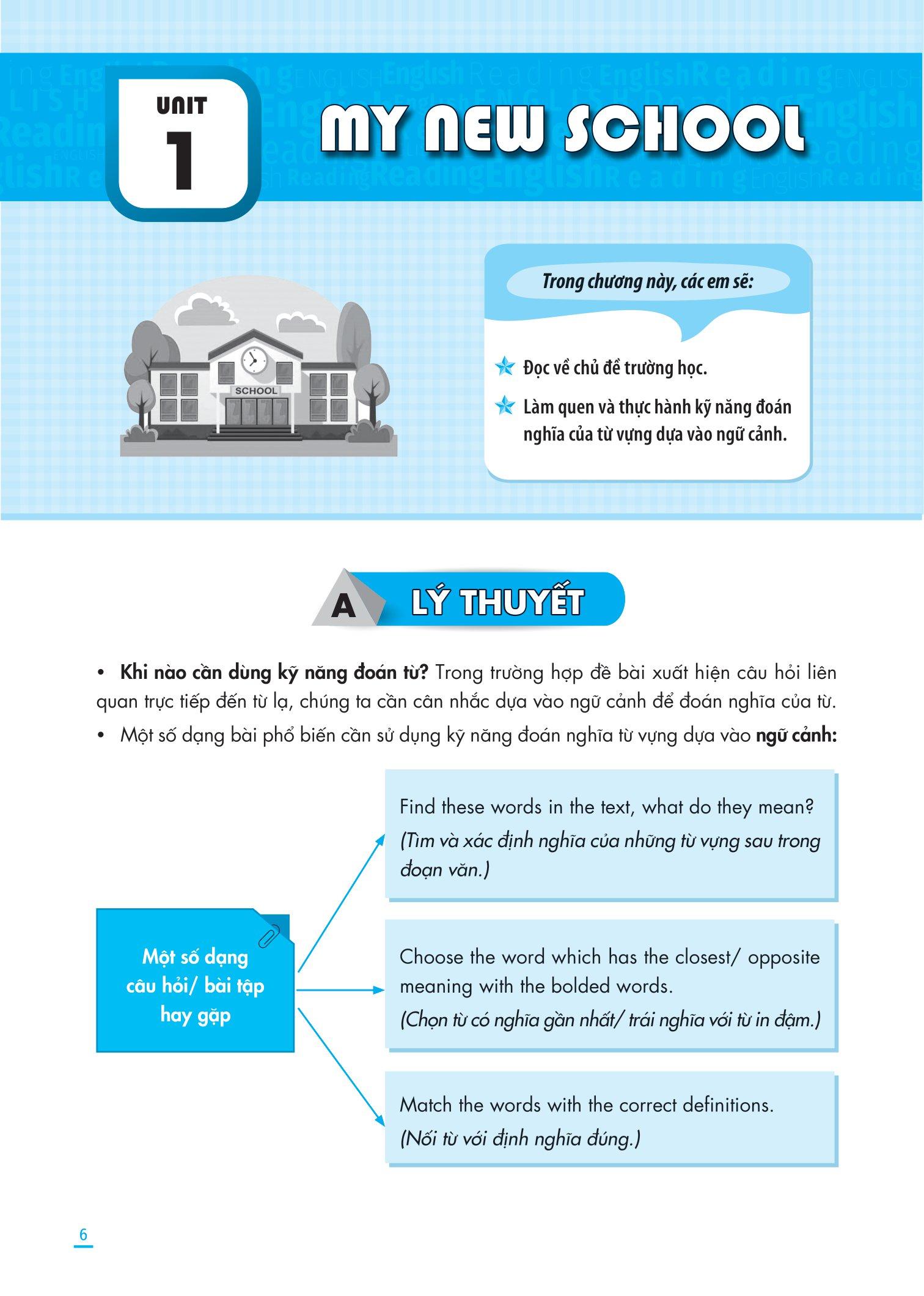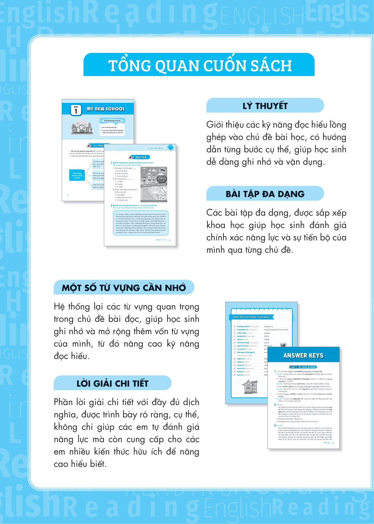 - Nội dung kiến thức bám sát khung chương trình của Bộ Giáo dục và Đào tạo Cuốn sách giúp các em nắm vững kiến thức đã học trên lớp cũng như ôn luyện thêm các bài tập nâng cao, hỗ trợ quá trình tự học tiếng Anh hiệu quả, giới thiệu các kỹ năng đọc hiểu với hướng dẫn từng bước cụ thể, giúp học sinh dễ dàng ghi nhớ và vận dụng.