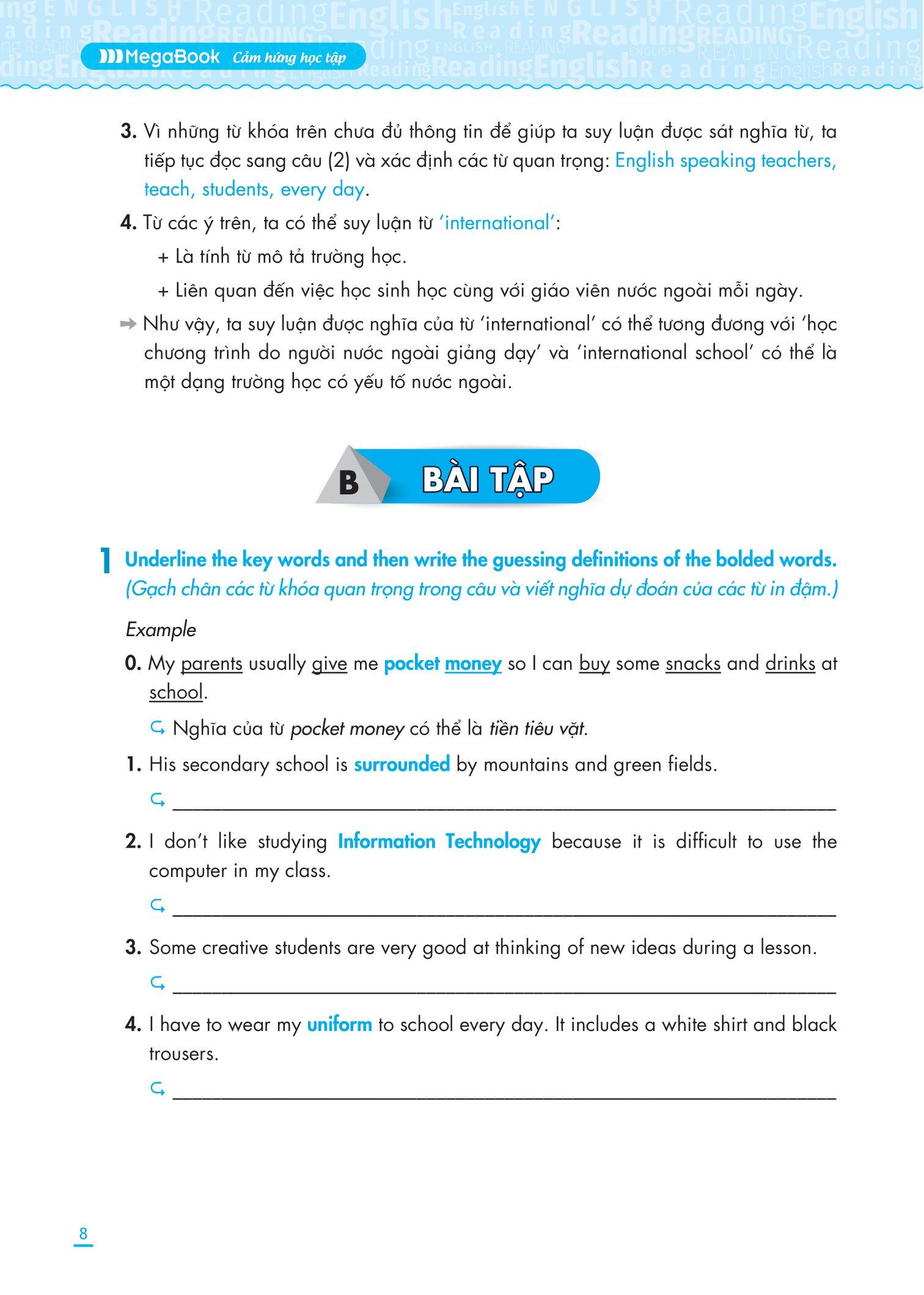 - Lời giải chi tiết, đầy đủ, rõ ràng Hệ thống lời giải chi tiết và đầy đủ dịch nghĩa, được trình bày rõ ràng, cụ thể, không chỉ giúp các em tự đánh giá năng lực mà còn cung cấp cho các em nhiều kiến thức hữu ích để nâng cao hiểu biết. Với sự tham gia đóng góp của đội ngũ biên soạn sáng tạo của Megabook và các tác giả uy tín, chúng tôi hi vọng rằng bộ sách “Kỹ năng đọc hiểu tiếng Anh” sẽ luôn là người bạn đồng hành của các em học sinh và là sự tin tưởng của các thầy cô giáo và các quý vị phụ huynh.