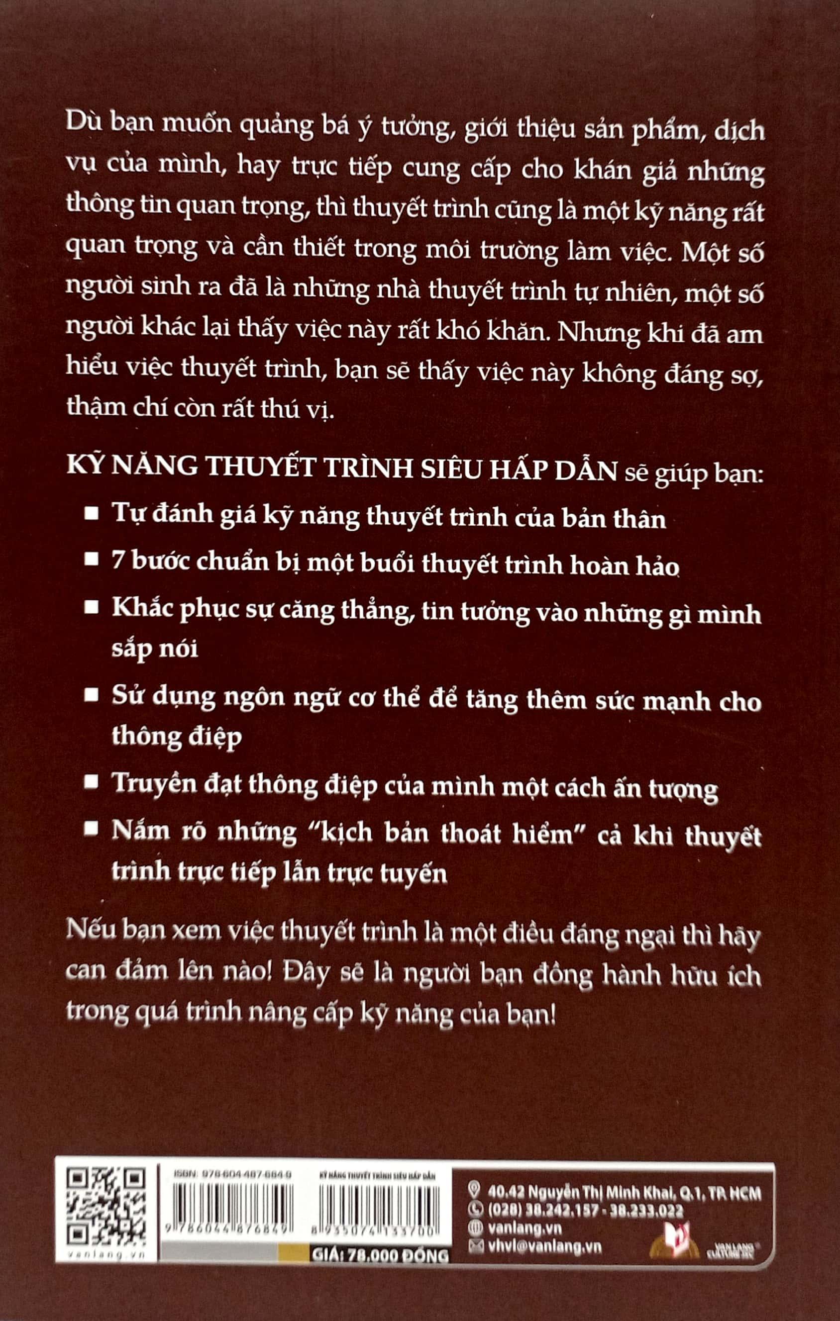 Kỹ Năng Thuyết Trình Siêu Hấp Dẫn Dù bạn muốn quảng bá ý tưởng, giới thiệu sản phẩm, dịch vụ của m.ình, hay trực tiếp cung cấp cho khán giả những thông tin quan trọng, thì thuyết trình cũng là một kỹ năng rất quan trọng và cần thiết trong môi trường làm việc. Một số người sinh ra đã là những nhà thuyết trình tự nhiên, một số người khác lại thấy việc này rất khó khăn. Nhưng khi đã am hiểu việc thuyết trình, bạn sẽ thấy việc này không đáng sợ, thậm chí còn rất thú vị. KỸ NĂNG THUYẾT TRÌNH SIÊU HẤP DẪN sẽ giúp bạn
