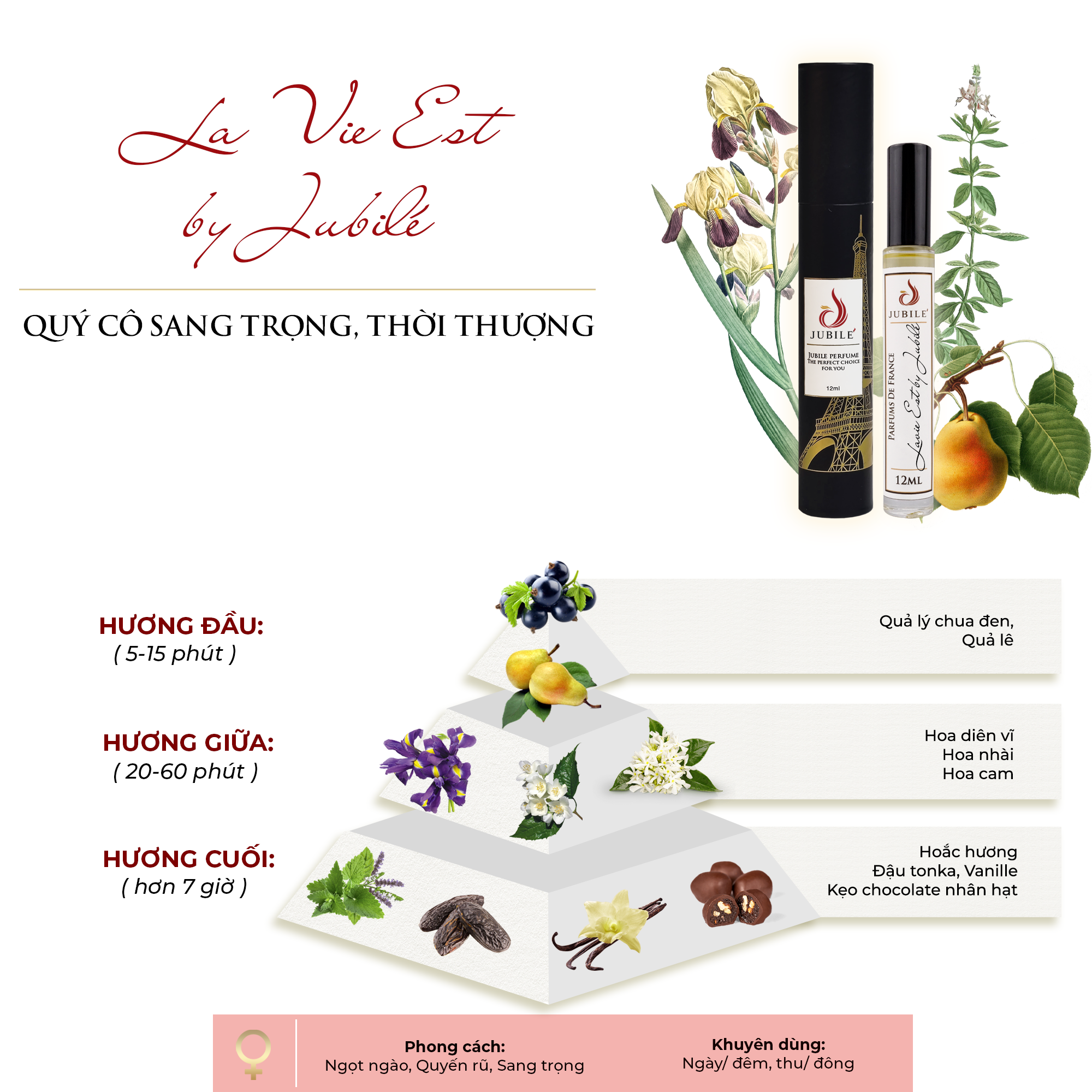 - Belle by Jubilé là sự hòa quyện quá đỗi ngọt ngào có sự khởi đầu phảng phất của Quả lý chua đen, Quả lê. Tăng dần là Hoa diên vĩ, Hoa nhài, Hoa cam vô cùng gợi cảm. kết thúc bằng Hoắc hương, Đậu Tonka, Vanille, Kẹo Chocolate nhân hạt. Một kết thúc rất đậm, tạo dấu ấn khó phai. Mô tả sản phẩm