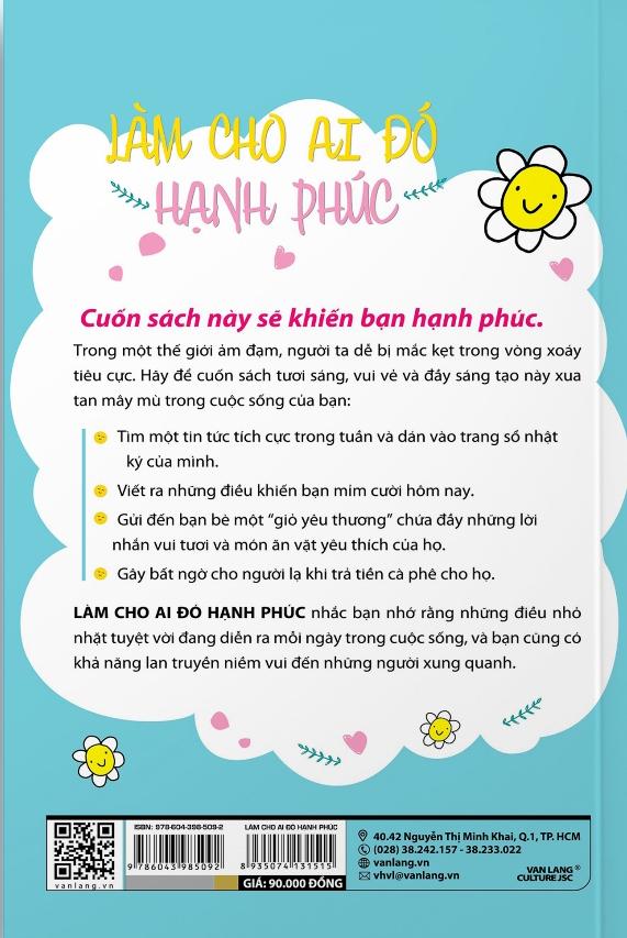 Làm Cho Ai Đó Hạnh Phúc - Make Someone Happy Cuốn sách này sẽ khiến bạn hạnh phúc. Trong một thế giới ảm đạm, người ta dễ bị mắc kẹt trong vòng xoáy tiêu cực. Hãy để cuốn sách tươi sáng, vui vẻ và đầy sáng tạo này xua tan mây mù trong cuộc sống của bạn: Tìm một tin tức tích cực trong tuần và dán vào trang sổ nhật ký của m.ình. Viết ra những điều khiến bạn mỉm cười hôm nay. Gửi đến bạn bè một “giỏ yêu thương” chứa đầy những lời nhắn vui tươi và món ăn vặt yêu thích của họ. Gây bất ngờ cho người lạ khi trả tiền cà phê cho họ. LÀM CHO AI ĐÓ HẠNH PHÚC nhắc bạn nhớ rằng những điều nhỏ nhặt tuyệt vời đang diễn ra mỗi ngày trong cuộc sống, và bạn cũng có khả năng lan truyền niềm vui đến những người xung quanh.
