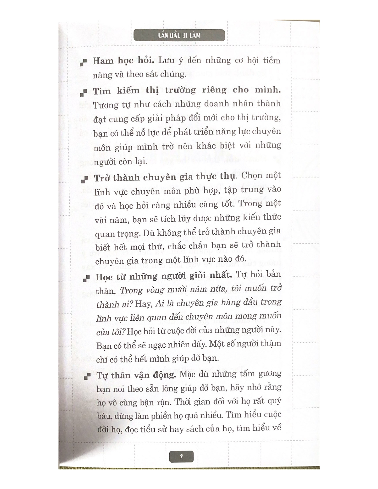 Lần Đầu Đi Làm-Vanlangbooks I.Giới thiệu sách Trường đại học KHÔNG dạy bạn cách thành công trong thế giới công việc. Không có bất kỳ khóa học hay giáo trình nào hướng dẫn cách xây dựng một sự nghiệp thành công mà nhiều người khao khát. "Lần Đầu Đi Làm" sẽ giúp bạn lấp đầy lỗ hổng kiến thức đó. Sách đưa ra những lời khuyên phù hợp cho bạn trẻ – những chuyên gia trẻ – đang tìm cách gầy dựng nền tảng vững chắc cho sự nghiệp. Sách sẽ cung cấp cho bạn: