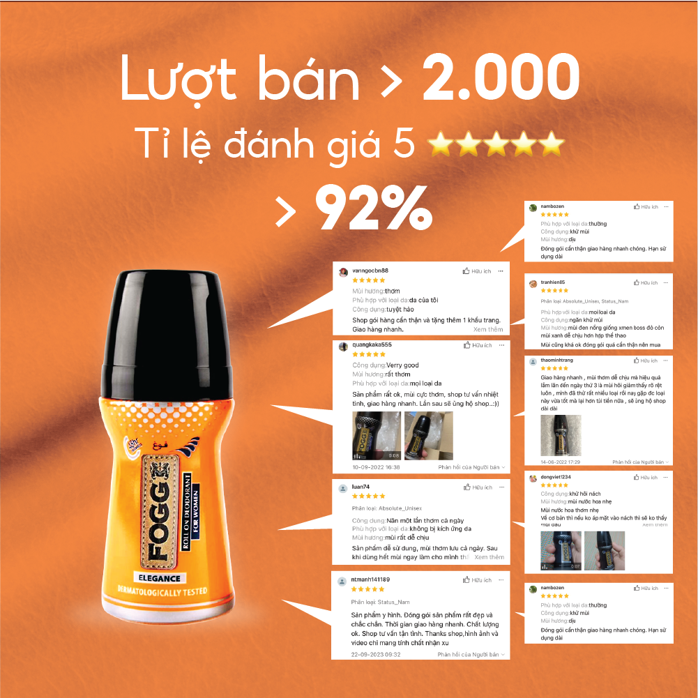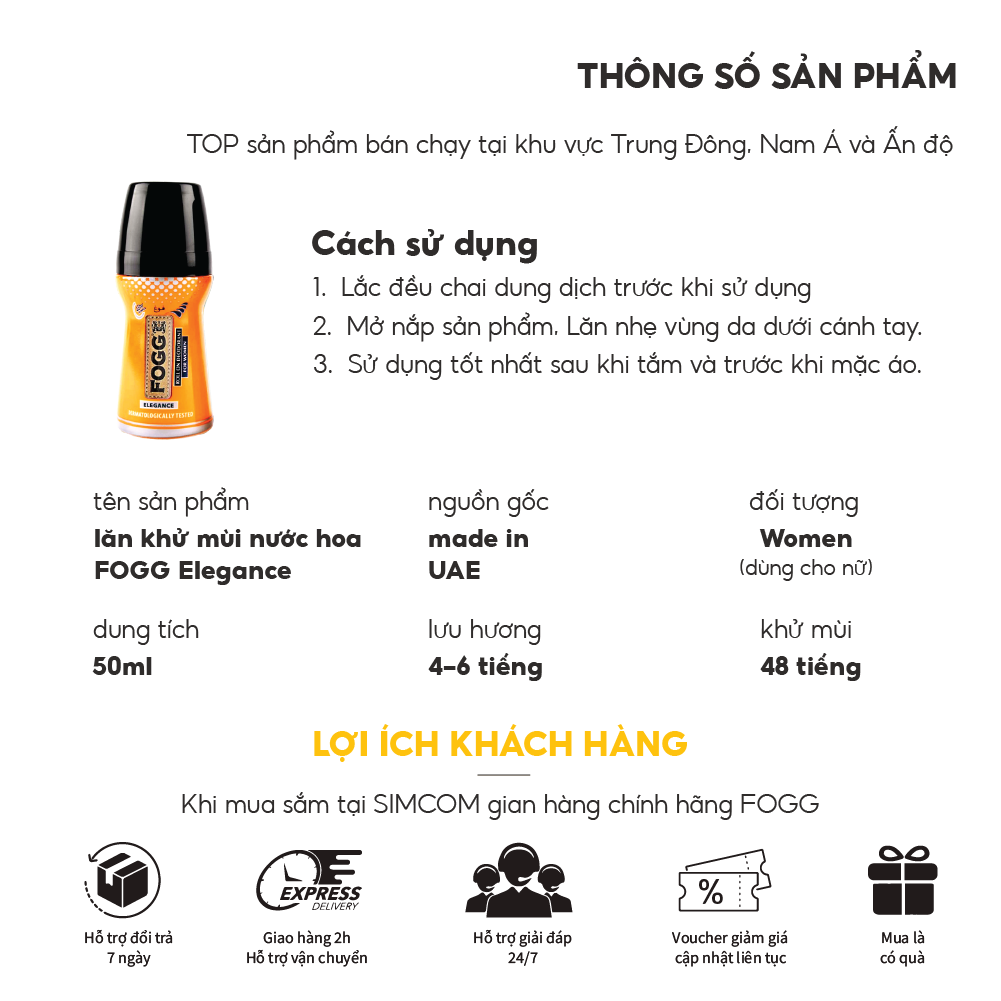 ✨Lăn khử mùi hương nước hoa FOGG Elegance 50ml, chính hãng dubai, dành cho nữ, dùng để lăn nách, giảm thiểu mùi cơ thể, lưu hương lâu 4-5 tiếng, khử mùi 48h, không kích ứng da, không thâm nách, không ố áo, Simcom