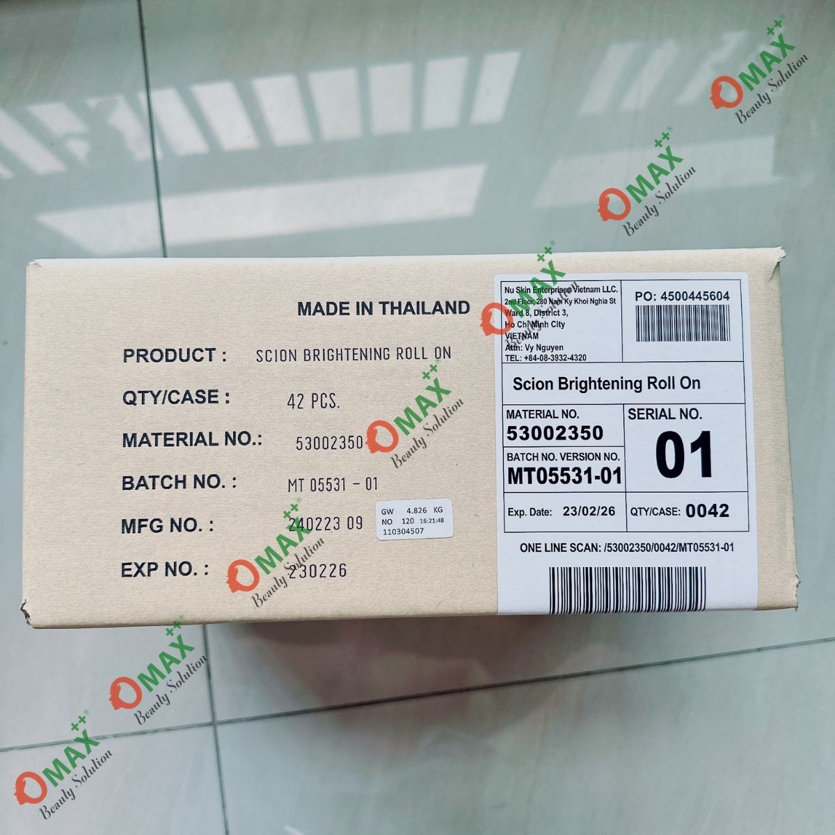 - Thông tin sản phẩm Sản phẩm: Lăn khử mùi Scion Brightening Roll On Thể tích: 75ml Số lượng: 01 chai Thương hiệu: NU SKIN Số giấy xác nhận nội dung quảng cáo của Sở Y Tế TP. Hồ Chí Minh: 784/2022/XNQC-YTHCM Số tiếp nhận Phiếu công bố: 154847/21/CBMP-QLD Xuất xứ: Thái lan Hoặc Mỹ ( Công dụng như nhau, khác nơi sản xuất còn tùy bạn lựa chọn )