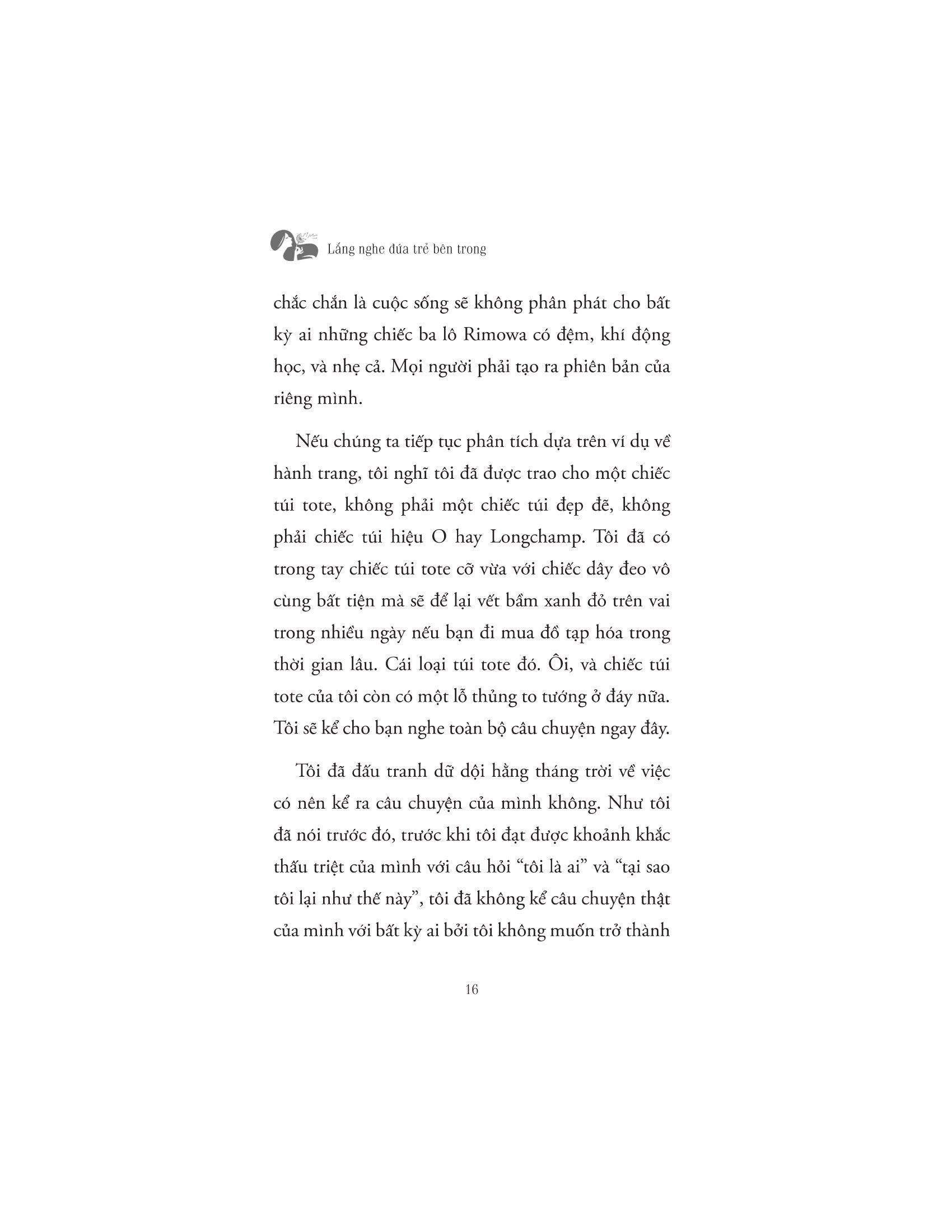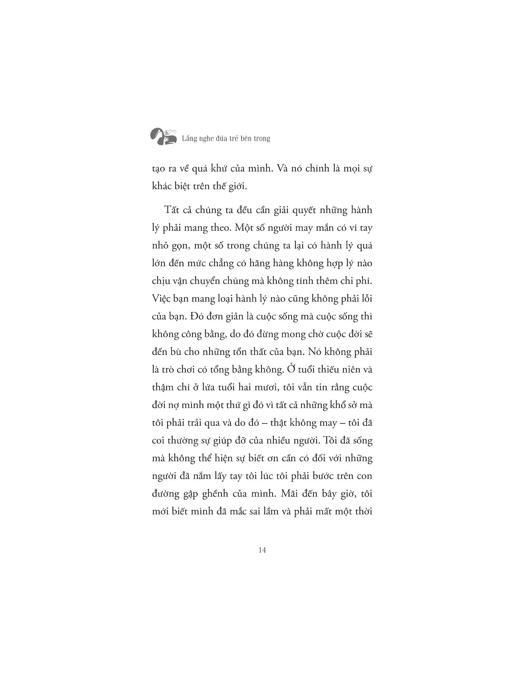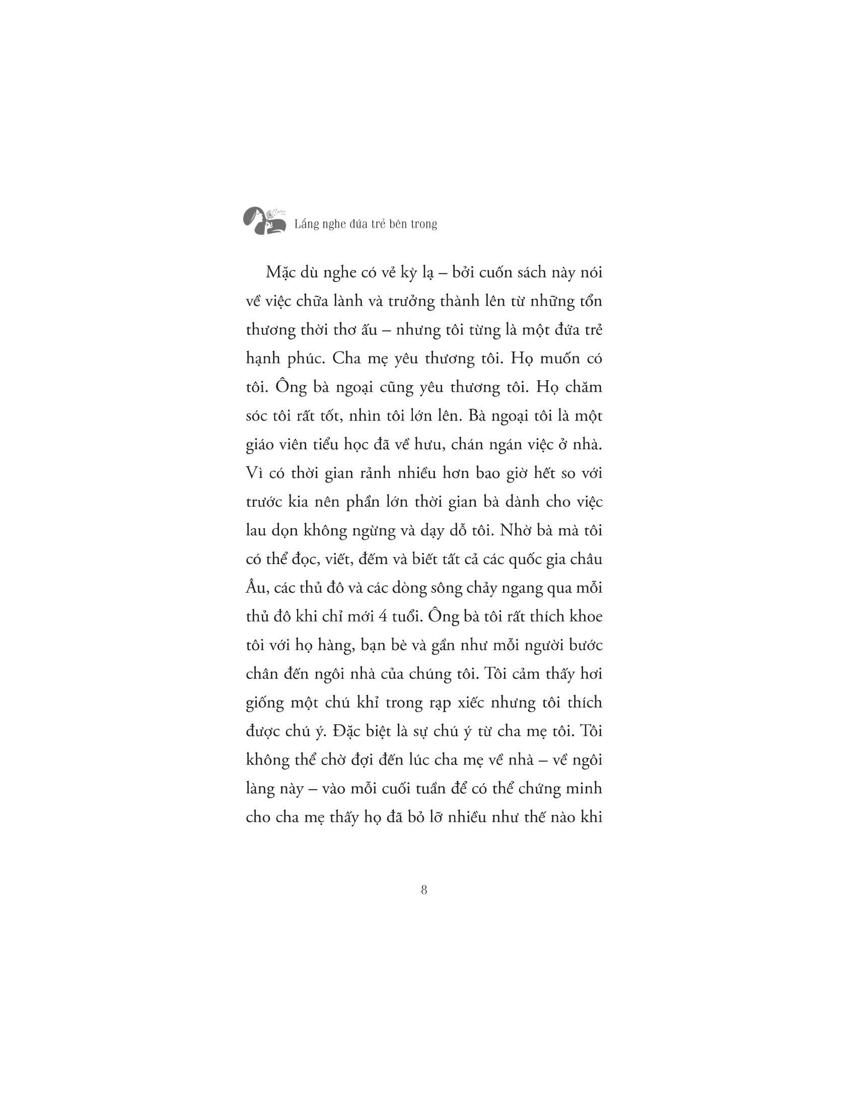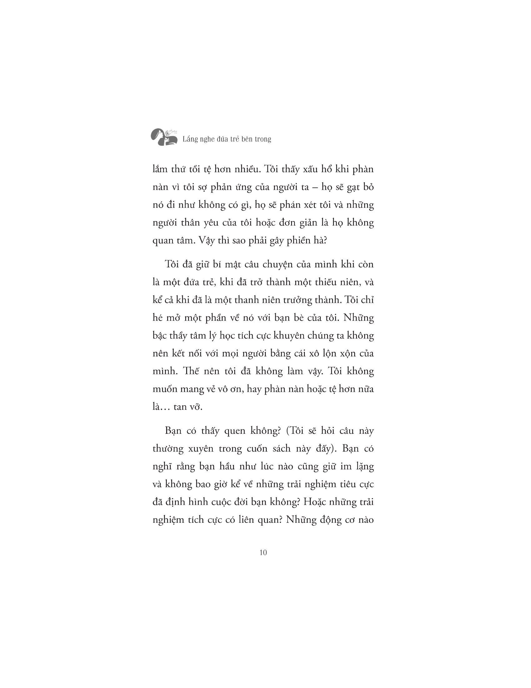 Và những tổn thương ấy đều không có vết sẹo nào chảy máu cả. Dẫu vậy nó vẫn đề lại trong tâm trí mỗi người một nét vẽ nghệch ngoạc. Cuốn sách “Lắng nghe đứa trẻ bên trong bạn” sẽ giúp bạn thấu hiểu cảm xúc, quay về với chính m.ình để yêu thương và chữa lành. Cuốn sách nhấn mạnh giá trị thực sự của bản thân bạn, học hỏi những kỹ năng để trở nên tự tin, cải thiện các mối quan hệ và cởi bỏ sự non nớt về mặc cảm xúc. Cuộc đời này là của bạn, vì thế đừng cầm bản đồ của người khác để dò đường đi của m.ình. Bạn có quyền quyết định cách bạn muốn sống. Hãy tìm ra sự can đảm của m.ình. Hãy sống một cách đích thực. Hãy bảo vệ bản thân và những gì quan trọng với bạn. Hãy phá kén, tỏa sáng theo cách riêng của m.ình. Khi chúng ta hành động dựa trên tiền đề của nhận thức và hành động dựa trên những giá trị tốt nhất của bản thân mình (thay vì nỗi sợ hãi, lo lắng và thiếu sót), chúng ta sẽ làm chủ vận mệnh của mình. Bởi chúng ta có quyền kiểm soát nó.