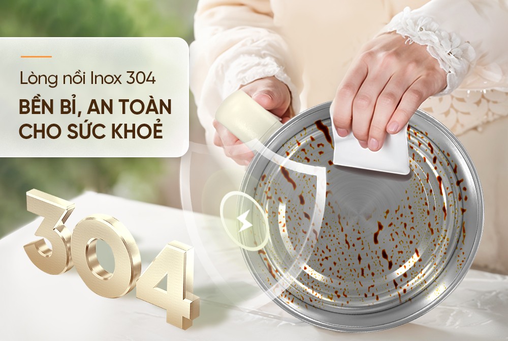 - Lòng nồi inox 304 không han gỉ - Bền bỉ, an toàn cho sức khỏe Lòng nồi được làm từ inox 304 cao cấp, an toàn cho sức khỏe và cực kỳ bền bỉ theo thời gian. Bề mặt trơn láng giúp vệ sinh nhanh chóng sau mỗi lần sử dụng, không lo bám dính hay ám mùi.
