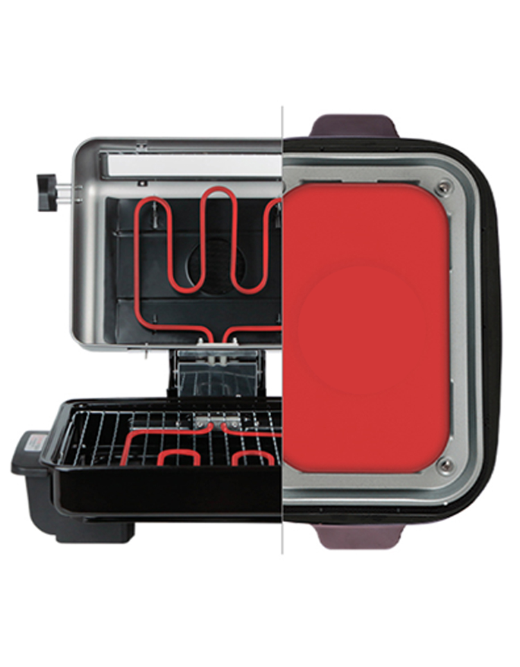 2 trong 1 gồm 2 lòng hợp kim phủ chống dính gốm Ceramic (lòng nướng bằng hơi nước và lòng nồi lẩu ) với 9 chức năng nấu (nấu lẩu, nướng, nướng bằng hơi nước,
