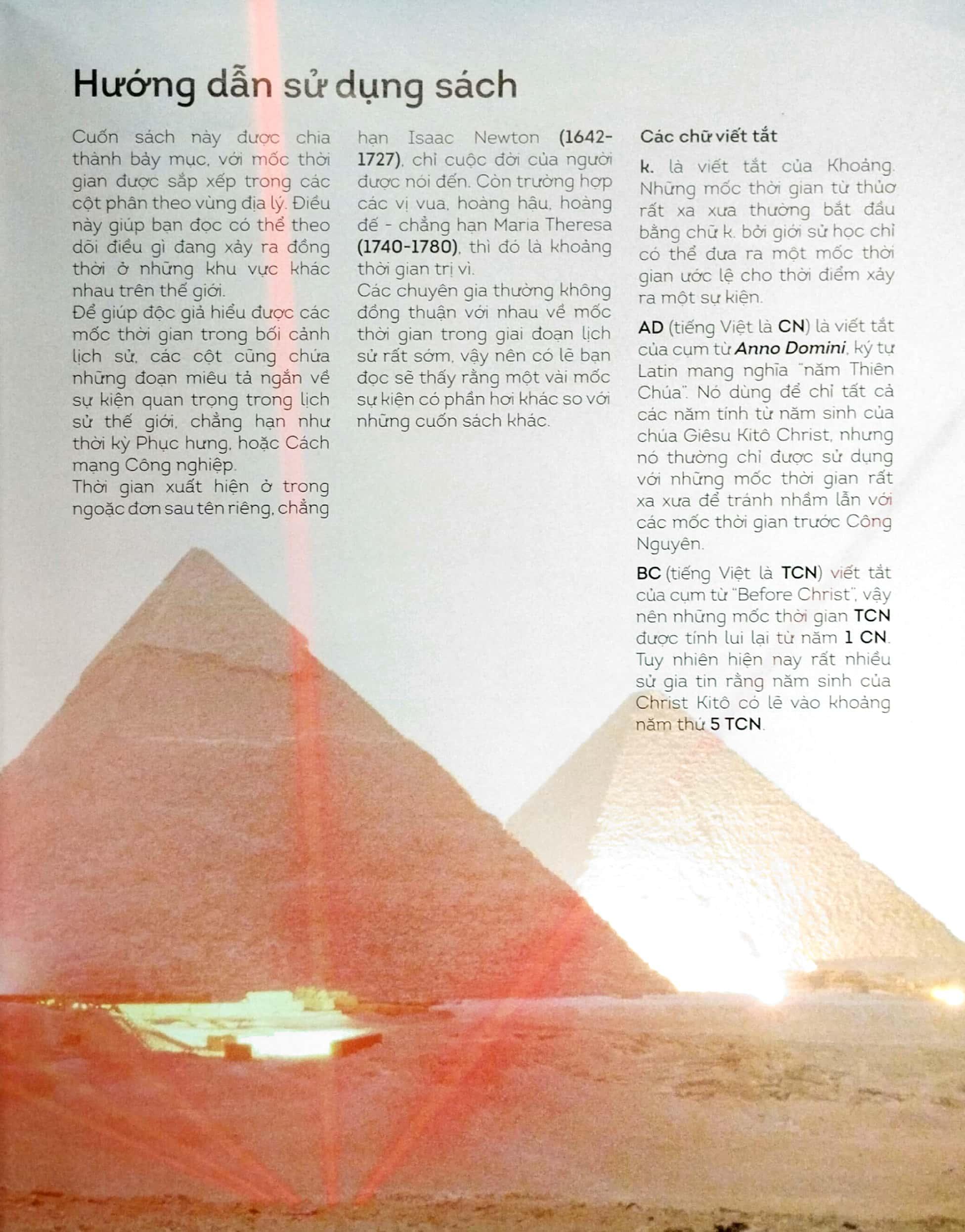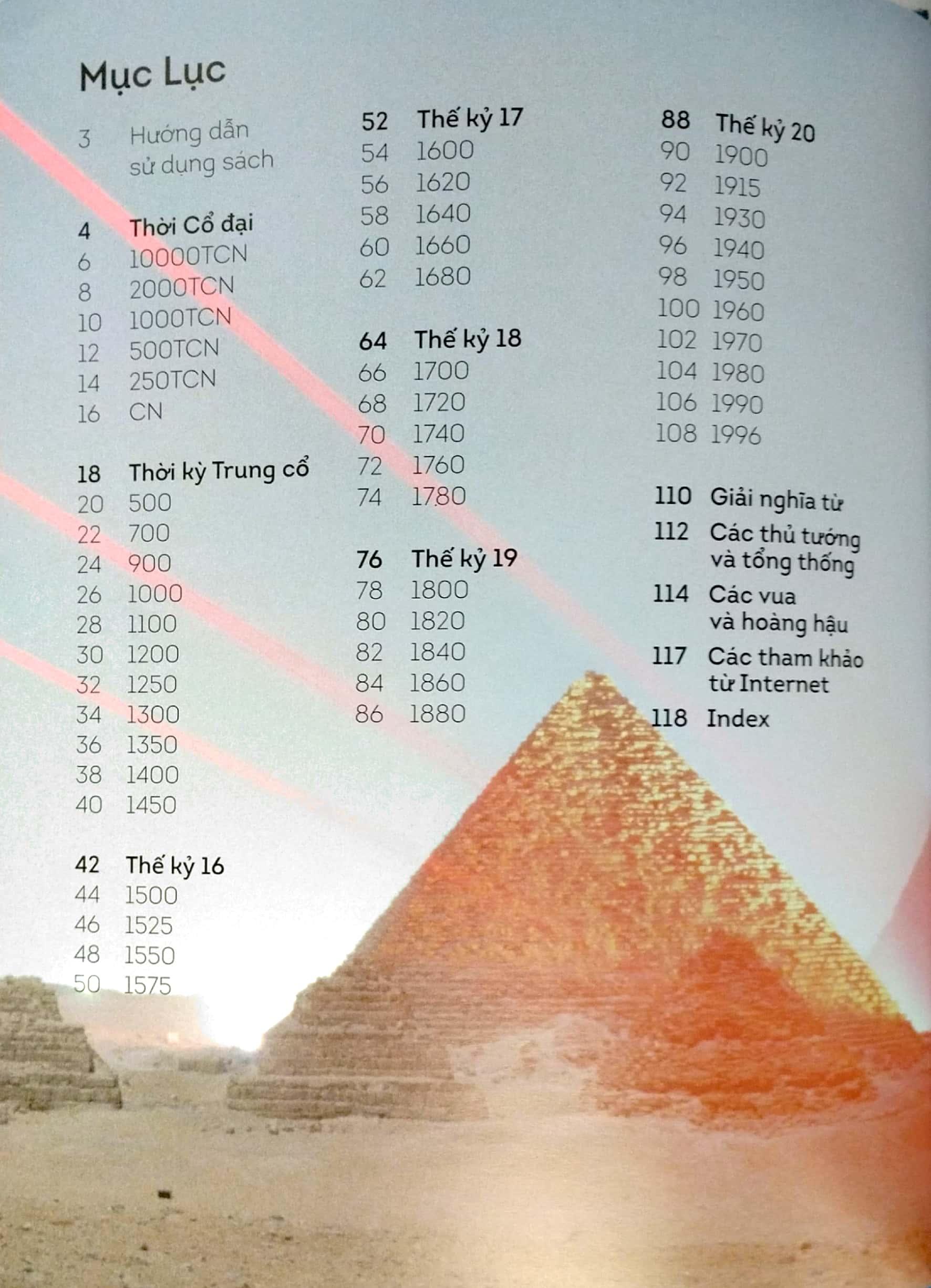 Theo dòng lịch sử đáp ứng mong muốn đó của bạn, với hơn 3500 mốc sự kiện, bao trùm những thứ “hay ho” nhất trong lịch sử loài người: các phát minh, phát kiến, các phong trào nghệ thuật, chiến tranh, các cuộc cách mạng, những đế chế vĩ đại v - xuyên suốt lịch sử văn minh của loài người từ thời kỳ Đồ Đá đến cuối thế kỷ 20. Không những thế, các mốc thời gian còn được sắp xếp song song rất tiện cho tra cứu, cũng như được minh họa vô cùng sống động, hấp dẫn. Cẩn thận! Bạn có thể sẽ “lạc trôi” theo dòng lịch sử đấy!