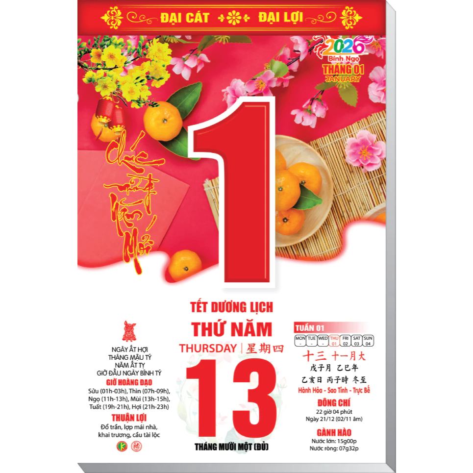 - Quyển Bloc lịch 2026 dùng gắn vào các loại bìa lịch treo tường, thay thế Bloc năm cũ. * QUY CÁCH BLOC LỊCH: - Chất lượng in công nghệ hiện đại, sắc nét, in