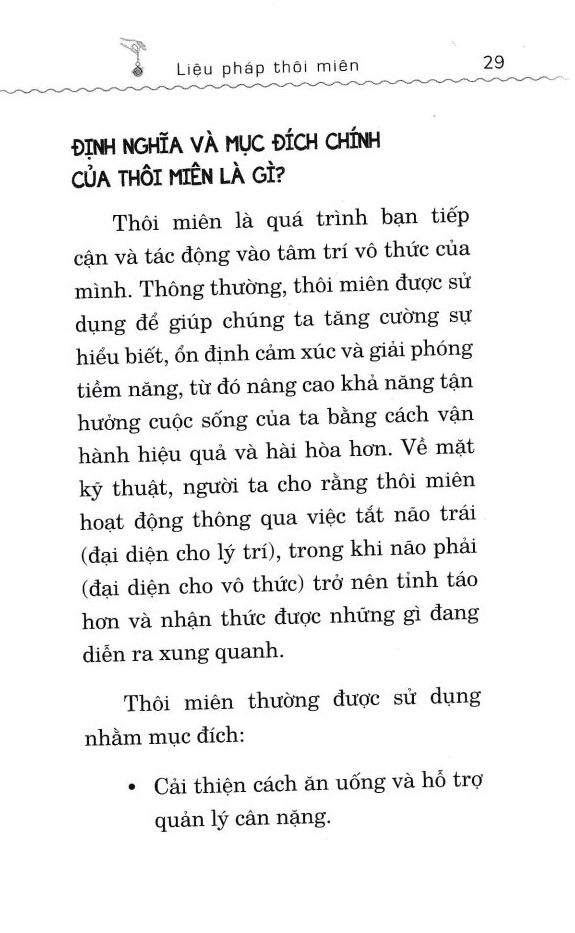 Bệnh nhân được đưa vào trạng thái thư giãn và tập trung tập trung để giúp họ thay đổi hành vi của họ và do đó cải thiện sức khoẻ. Họ trở nên hấp dẫn và tương đối bị phân tâm nhưng không vô thức về môi trường xung quanh và những trải nghiệm mà họ đang trải qua. Một số bệnh nhân tự học thôi miên.