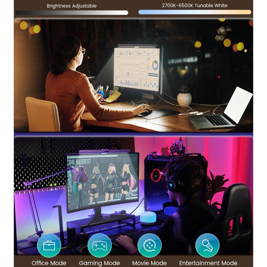 • Ánh sáng chân thực, bảo vệ mắt tối ưu Đèn treo màn hình RGB có chỉ số hoàn màu cao lên đến Ra95 giúp khôi phục màu sắc trung thực của các đồ vật trong nhà, không gây mỏi mắt khi sử dụng trong thời gian dài. Hơn nữa, người dùng còn có thể dễ dàng tùy chỉnh độ sáng và nhiệt độ màu theo nhu cầu sử dụng hoặc chuyển đổi linh hoạt giữa chế độ trò chơi và chế độ văn phòng chỉ với 1 phím bấm thông qua công tắc điều khiển không dây được trang bị.