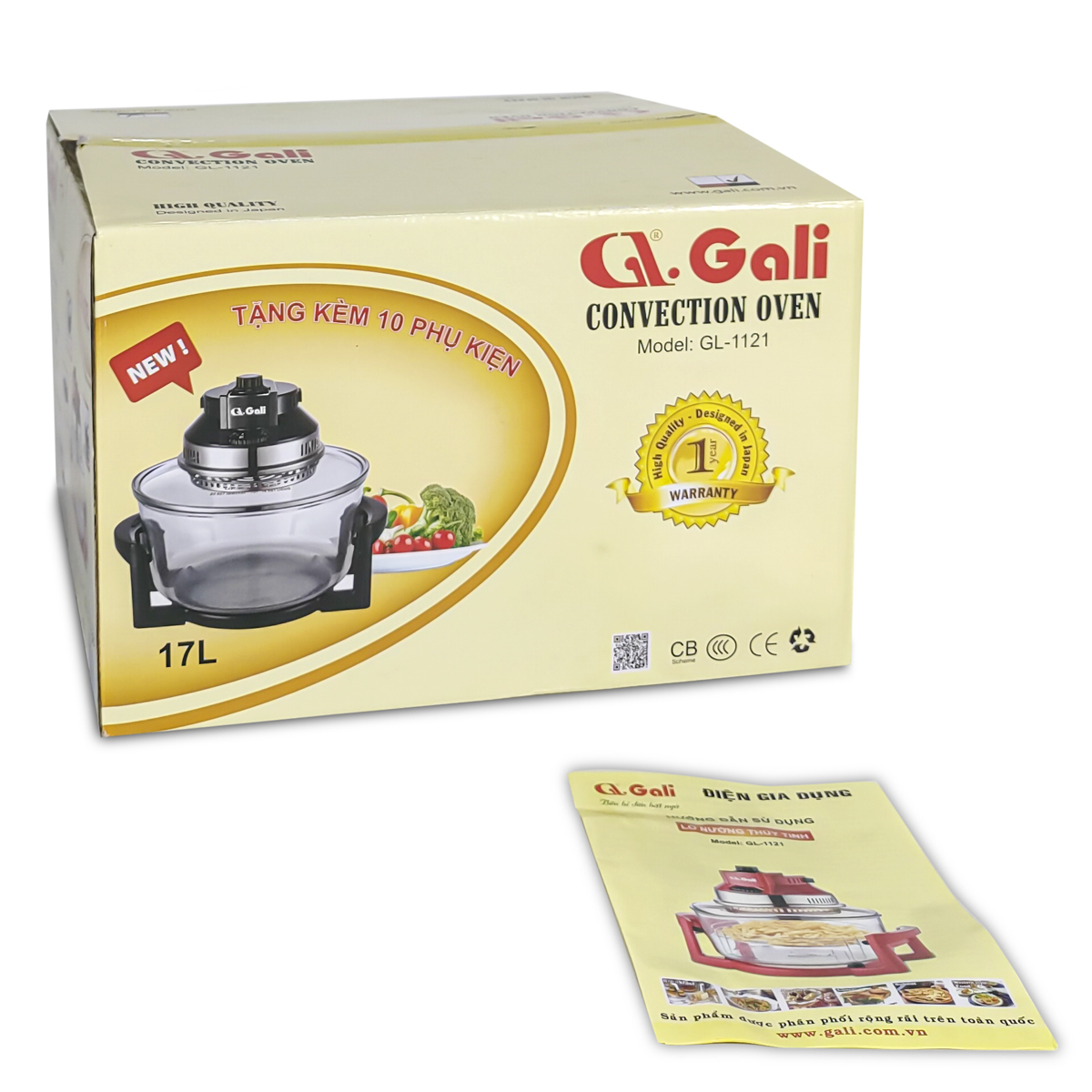 - Sản phẩm lò nướng khi giao hàng bao gồm: đầu lò, lòng thủy tinh, chân lò, hướng dẫn sử dụng và phiếu bảo hành 12 tháng và 08 phụ kiện kèm theo gồm: Vỉ nướng cao và vỉ nướng thấp, khay nướng bánh và hứng dầu mỡ, vành inox, tay lấy thực phẩm, khay và vỉ nướng. Gian Hàng Gali Chính Hãng cam kết: