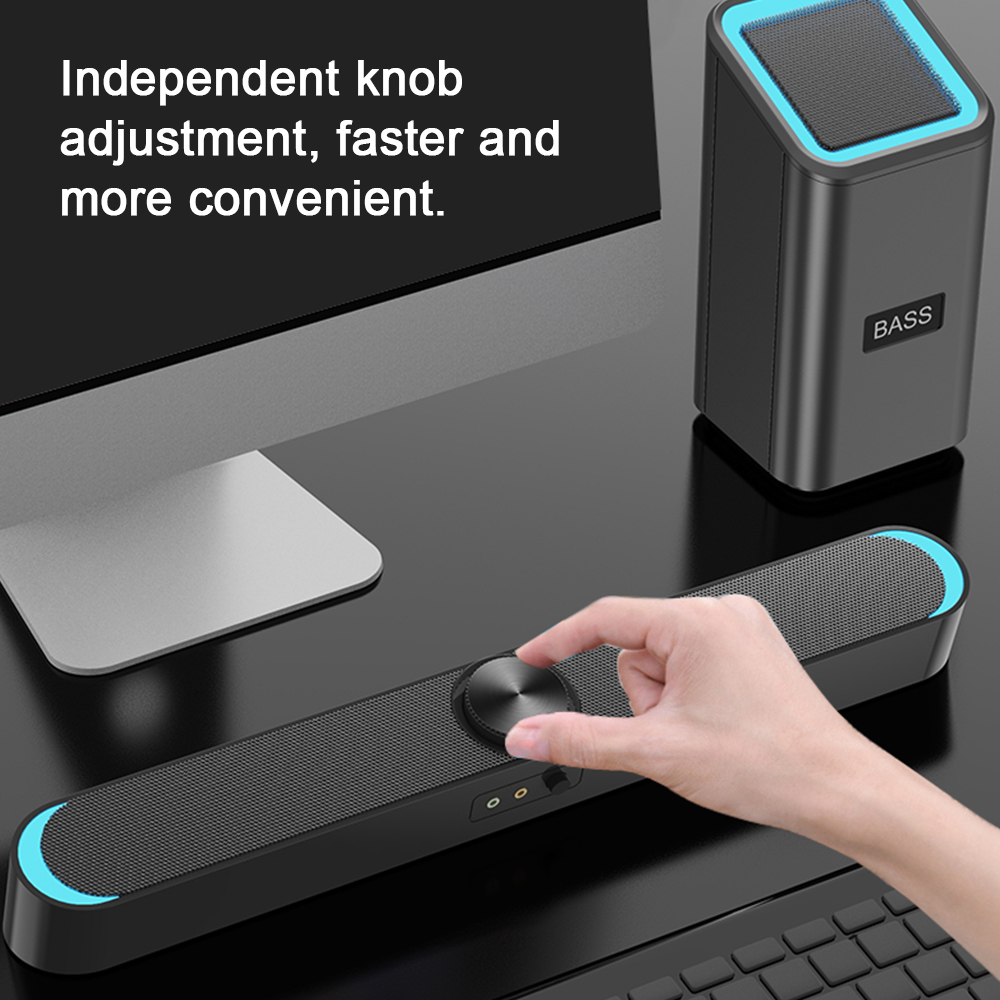 Features: Comes with 2*5W double horns, surround sound and the deep bass matched, bringing you high-quality music. Compatible with computer, mobile phone, TV, tablet, game consoles and other 3.5mm audio devices. Independent volume knob, convenient