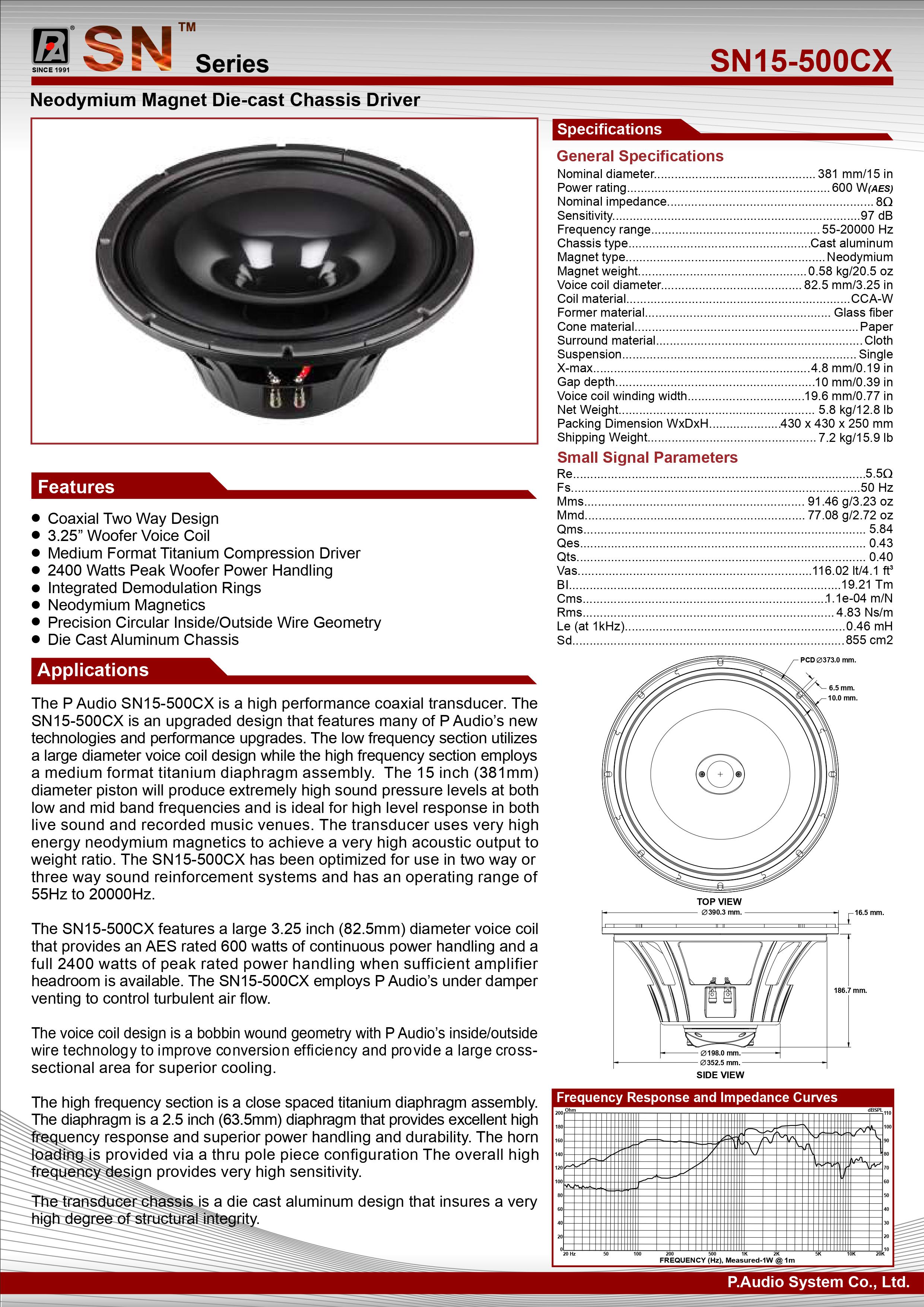 Xuất xứ: Ý Độ nhạy trung bình 98 dB SPL 1W / 1m. 75 mm (3 in) Interleaved Sandwich Voice coil (ISV). Công suất 500W. Công suất liên tục 800W. Nam châm từ neodymium bên