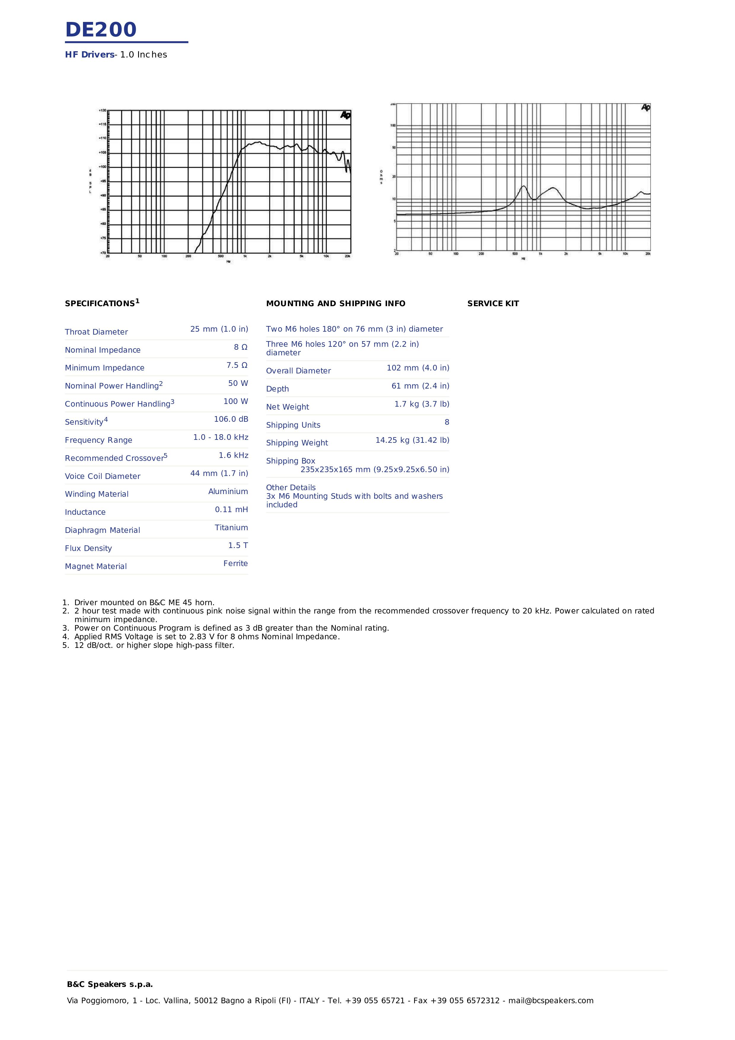 Loa Treble B&C SPEAKERS DE200 – Hàng Chính Hãng Xuất xứ: Italia Sử dụng họng 1" ( HỌNG ME 45) Voice coil aluminium 44mm (1.7") Công suất: 100w Công suất đỉnh 200 W