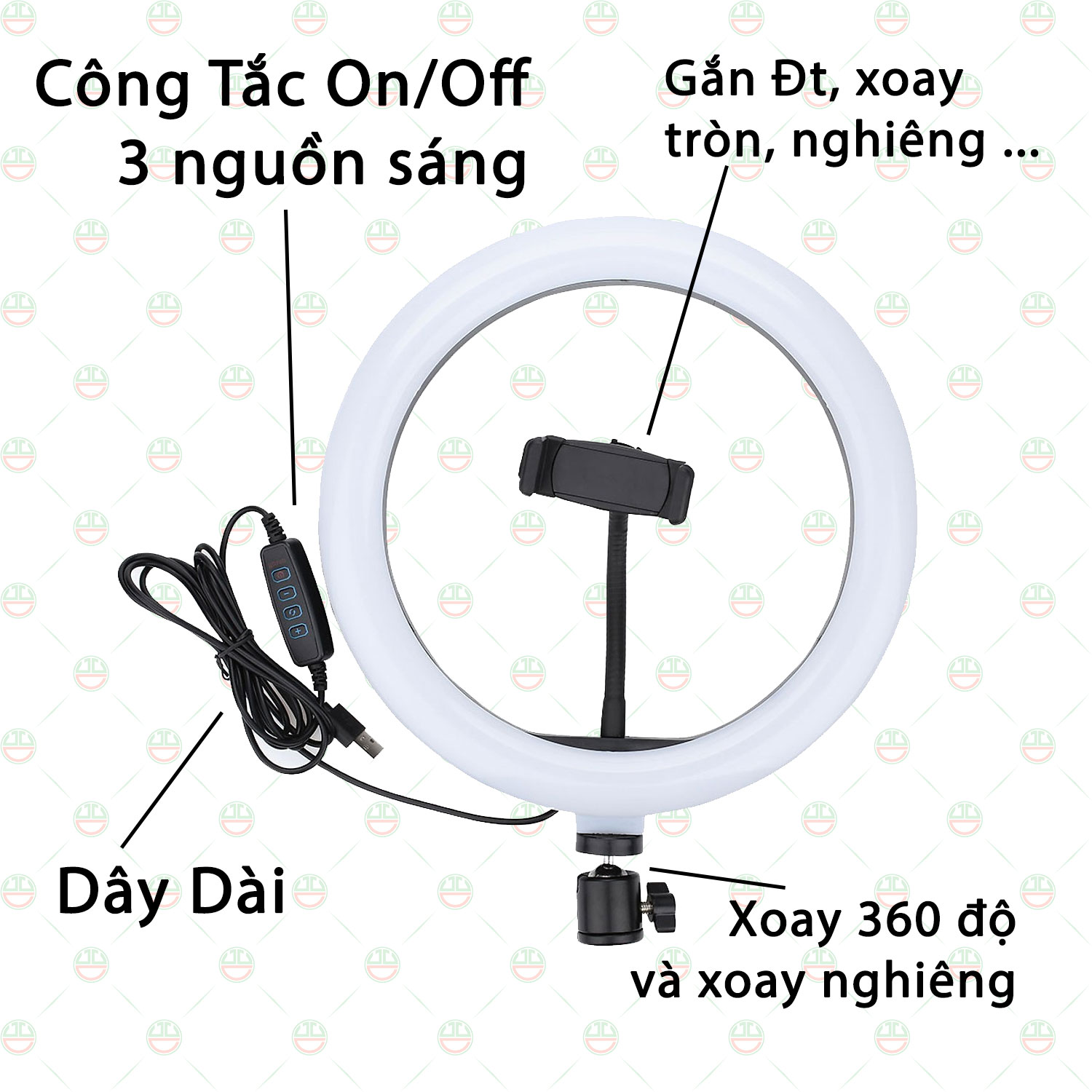 Bộ sản phẩm gồm: 1 đèn 33cm, 1 giá kẹp điện thoại, 1 đế 3 chân kéo dài 2m1