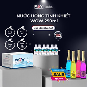 MUA 3 THÙNG TẶNG 3 THÙNG Nhà sản xuất: FOY VIET NAM Dòng sản phẩm: Nước tinh khiết WOW 2024 250ml – Thùng 24 chai WOW không chỉ là nước uống mà còn là một tác phẩm nghệ thuật tinh tế của sự hoàn hảo và đẳng cấp. Nước tinh khiết WOW được sản xuất thông qua quy trình lọc khắt khe và công nghệ hiện đại từ Mỹ, tạo nên một sản phẩm vô cùng cao cấp, độc đáo và mang tên gọi WOW. Nguồn nước được xử lý qua từng giai đoạn thô từ các bộ lọc tinh khác nhau, từ Filter lọc than đá sỏi đến Softener làm mềm nước. Sau đó, nước được lọc qua hệ thống RO để loại bỏ tất cả các tạp chất. Quy trình lọc hiện đại của Mỹ đã cho ra nguồn nước tinh khiết với chỉ số TDS: 0.00 - 0.05 Quy trình đóng chai tự động và khép kín giúp nước thành phẩm trước khi đóng chai được xử lý bằng đèn UV và ozone, đảm bảo diệt khuẩn, loại bỏ 100% tạp chất và khử mùi tuyệt đối. ĐẶC ĐIỂM NỔI BẬT của WOW: Nước tinh khiết 100%, không màu, không mùi, không chứa tạp chất, vi khuẩn, virus. Đóng gói tiện lợi trong thùng 24 chai, giúp bảo quản và sử dụng dễ dàng. Thiết kế chai sang trọng, thon gọn, cứng cáp, dễ mang theo. WOW - Mỗi giọt nước là một hòa âm tinh tế của tự nhiên, mang lại trải nghiệm nước uống hoàn hảo. Từng giọt là sự kết hợp tinh tế giữa thiên nhiên và công nghệ hiện đại. Hãy khám phá sự khác biệt và đẳng cấp cùng WOW - Nước tinh khiết cao cấp từ FOY VIET NAM! FOY VIET NAM - FOUNTAIN OF YOUTH