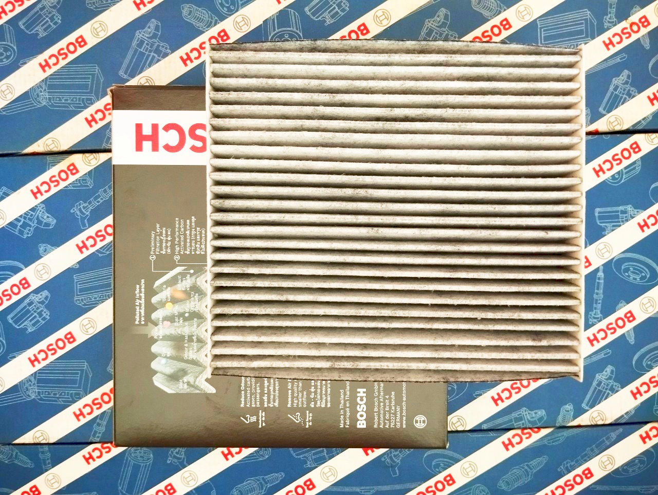 Công nghệ lọc điều hòa than hoạt tính cuả Bosch lọc hiệu quả các loại khuẩn ẩm mốc và các mùi khó chịu như ôzôn, oxit nitơ trong khoang xe • Ưu điểm vượt trội của bộ lọc nhớt Bosch: - Cấu tạo đa tầng, gồm 3 lớp sợivới kích thước sợi khác nhau,có thể hoạt động hiệu quả ở nhiệt độ -40oC đến 85oC - Lớp vi sợi mang cấu trúc tĩnh điện lọc được những phân tử có kích cỡ nhỏ nhất đến 0,0025 mm như phấn hoa hay vi khuẩn - Cấu trúc nếp gấp chắc chắn, giữ bụi rất tốt - Lọc được tới 99% khí độc và mùi khó chịu, bảo vệ hành khách khỏi các chất bụi bẩn trong không khí - Bảo vệ hệ thống điều hòa nhiệt độ, giúp máy điều hòa nhiệt độ hoạt động hết công năng và không gây ra hiện tượng mờ kính - Thân thiện với môi trường nhờ nguyên liệu cấu thành phi kim loại có khả năng phân hủy dễ dàng - Đáp ứng hoàn toàn các tiêu chuẩn về bộ lọc khí của EU, US - Chất lượng chính hãng