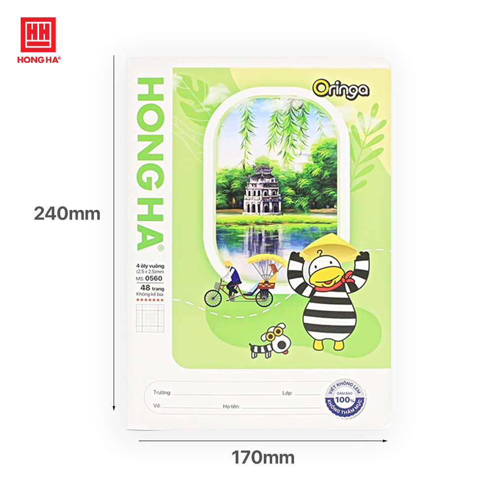 Vở 4 ô ly 48 trang School Animal Hồng Hà 0560 phù hợp cho học sinh tiểu học, tập viết chữ. Giấy trắng tự nhiên, bề mặt giấy láng mịn, viết êm tay, tạo nét chữ đẹp. Giấy viết không nhòe, không thấm mực sang trang sau. Dòng kẻ: 4 ô ly vuông (2.5 x 2.5) mm Kích thước: 170 x 240 (±2mm) Số trang: 48 trang không kể bìa Định lượng: 110g/m² Độ trắng: 90 - 92%ISO Đóng gói: 5 quyển/lốc - 120 quyển/thùng HỒNG HÀ – 62 NĂM XÂY DỰNG VÀ PHÁT TRIỂN Công ty CP Văn phòng phẩm Hồng Hà được thành lập vào ngày 1/10/1959, trải qua 62 năm trưởng thành và phát triển, thương hiệu Văn phòng phẩm Hồng Hà đã để lại dấu ấn sâu đậm trong tâm trí nhiều thế hệ người tiêu dùng Việt Nam với những sản phẩm như bút Trường Sơn, Hoàn Kiếm, Hồng Hà… Với phương châm sản xuất những sản phẩm chất lượng tốt nhất phục vụ người tiêu dùng, Công ty CP Văn phòng phẩm Hồng Hà luôn không ngừng nỗ lực mang đến cho khách hàng những sản phẩm vượt trội, thân thiện với môi trường và an toàn cho sức khỏe. Hiện tại, số lượng sản phẩm mang thương hiệu Hồng Hà đã lên tới hàng ngàn sản phẩm và được chia thành 10 ngành hàng chính: – Vở viết – Sổ – Bút – Dụng cụ học sinh – Xuất bản phẩm – Họa phẩm – Đồ dùng văn phòng – Ba lô, túi cặp – Đồ chơi thông minh – Vải không dệt " CẦN VĂN PHÒNG PHẨM, ĐÃ CÓ HỒNG HÀ"