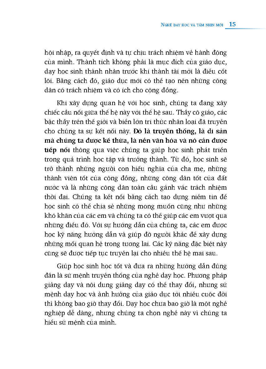 Lời Khuyên Dành Cho Thầy Cô Thầy cô là người có ảnh hưởng trực tiếp đến sự phát triển của quốc gia và nhân cách của thế hệ tương lai. Ngày nay, môi trường giáo dục đã có nhiều thay đổi. Thầy cô giáo không còn là nguồn tri thức duy nhất, vì học sinh có thể học bất cứ điều gì từ internet, truyền hình và từ trải nghiệm cuộc sống. Vì vậy, vai trò của thầy cô giáo không chỉ truyền đạt kiến thức như trước, mà còn là khuyến khích việc học và dạy cách học sao cho hiệu quả. Là người dành nhiều tâm huyết cho giáo dục và có nhiều kinh nghiệm trong giảng dạy, giáo sư John Vu đã nhận ra được những vấn đề mà các thầy cô giáo đang gặp phải, và đúc kết qua cuốn sách “Lời khuyên dành cho thầy cô”. Nối tiếp , cuốn sách này tuyển chọn những bài viết đầy tâm huyết trên trang blog của GS John Vu dành riêng cho các thầy cô giáo, những người luôn trăn trở làm thế nào để có thể hỗ trợ học sinh, sinh viên của mình tốt nhất trong việc học. “Thầy là một nhạc trưởng và lớp học là dàn nhạc của thầy. Mỗi học trò chơi một nhạc cụ khác nhau với mức độ thông thạo khác nhau. Công việc của thầy là phát triển kỹ năng và làm cho từng nhạc cụ đi vào cuộc sống như một chỉnh thể thống nhất, để tạo ra một bản giao hưởng kỳ diệu cho thế giới”, lời chia sẻ mở đầu của GS John Vu giúp các thầy cô giáo có cái nhìn sâu sắc hơn về vai trò không thể thiếu của mình trong việc đào tạo thế hệ mai sau. Trong tám chương sách, GS John Vu chia sẻ góc nhìn mới về giáo dục và nghề dạy học, những phương pháp giảng dạy hiệu quả nhằm giúp học sinh, sinh viên phát triển tinh thần tự học, kinh nghiệm giải quyết vấn đề. Ông cũng hướng dẫn cách làm thế nào để giúp học sinh, sinh viên phát triển tư duy khoa học cũng như những kỹ năng cần thiết trong thời đại công nghệ. Ngoài ra, cuốn sách này còn giúp các thầy cô giáo mở rộng tầm nhìn ra thế giới, ý thức được những xu hướng thay đổi mang tính toàn cầu, từ đó có những phương pháp giảng dạy và lời khuyên phù hợp nhất cho học sinh, sinh viên của mình. ● Chương 1: Nghề dạy học và tầm nhìn mới ● Chương 2: Dạy học là phát triển con người ● Chương 3: Phương pháp dạy và học hiệu quả ● Chương 4: Về phương pháp học chủ động ● Chương 5: Về phương pháp thảo luận ● Chương 6: Chia sẻ kinh nghiệm ● Chương 7: Những ngành học thiết yếu đang cần giảng viên ● Chương 8: Nền giáo dục đích thực Lời Khuyên Dành Cho Thầy Cô thật sự là một cuốn cẩm nang dành cho các thầy cô giáo trẻ, giúp họ biết cách làm như thế nào để việc giảng dạy đạt hiệu quả tốt nhất, đáp ứng nhu cầu của thế giới không ngừng thay đổi. Ngoài ra, các thầy cô giáo cũng có thể tìm thấy những đúc kết đầy tâm huyết từ kinh nghiệm giảng dạy của GS John Vu như: làm thế nào để học sinh thích học; kinh nghiệm xây dựng môi trường lớp học tích cực; làm thế nào để hướng dẫn học sinh học từ thất bại… Hơn nữa, cuốn sách còn có một phần riêng, giới thiệu về các ngành học thiết yếu trong thời đại công nghệ, để các thầy cô giáo tương lai có thể chọn chuyên ngành giảng dạy phù hợp. Nghề nào cũng có cái khó đặc thù, nhưng mang trong mình sứ mệnh nuôi dưỡng trí tuệ và tâm hồn con người, nghề dạy học là một nghề vô cùng cao quý và thầy cô giáo dường như phải gánh trên vai nhiều trọng trách hơn. Với văn phong giản dị, cách thức chia sẻ quan điểm từ tầm nhìn và kinh nghiệm của bản thân thông qua tình huống thực tiễn cùng việc lập luận vấn đề rõ ràng, GS John Vu đã giúp chúng ta nhận ra tầm quan trọng của giáo dục và vai trò của các thầy cô giáo, rằng “chính nền giáo dục, chất lượng giáo dục xã hội chứ không phải bất kỳ thứ gì khác bên ngoài sẽ tạo nên đẳng cấp, giá trị của một quốc gia”. VỀ TÁC GIẢ: Giáo sư John Vu tên thật là Vũ Văn Du, ông còn được nhiều người biết đến là dịch giả Nguyên Phong. Ông rời Việt Nam du học ở Hoa Kỳ từ năm 1968 và tốt nghiệp cao học hai ngành Sinh vật học và Điện toán. Ngoài công việc là một kỹ sư cao cấp tại Boeing trong hơn hai mươi năm, ông còn làm công tác nghiên cứu công nghệ và là giảng viên tại Đại học Camegie Mellon và Đại học Seattle. Ông cũng đi giảng dạy tại một số trường đại học quốc tế ở Trung Hoa, Hàn Quốc, Nhật Bản về lĩnh vực công nghệ phần mềm. Những tác phẩm nổi tiếng của Giáo sư John Vu trong bộ sách chắp cánh cho tuổi trẻ Việt Nam gồm “Khởi hành”, “Kết nối”, “Bước ra thế giới”, và “Kiến tạo thế hệ Việt Nam ưu việt”, và bộ sách dành cho cha mẹ và thầy cô gồm “Lời khuyên dành cho các bậc cha mẹ”, và giờ là “Lời khuyên dành cho thầy cô” .