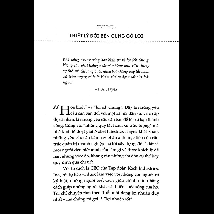 Từ thực tế xuyên suốt hoạt động kinh doanh của tập đoàn Koch trên toàn thế giới trong gần một thế kỷ, tác giả cuốn sách và cũng là Chủ tịch kiêm CEO của tập đoàn Koch – Charles G. Koch – đã tiết lộ “bí mật” khiến công ty của ông tăng trưởng gấp 27 lần trong năm thập kỷ và trung bình cứ sáu năm một lần tăng gấp đôi giá trị doanh nghiệp.