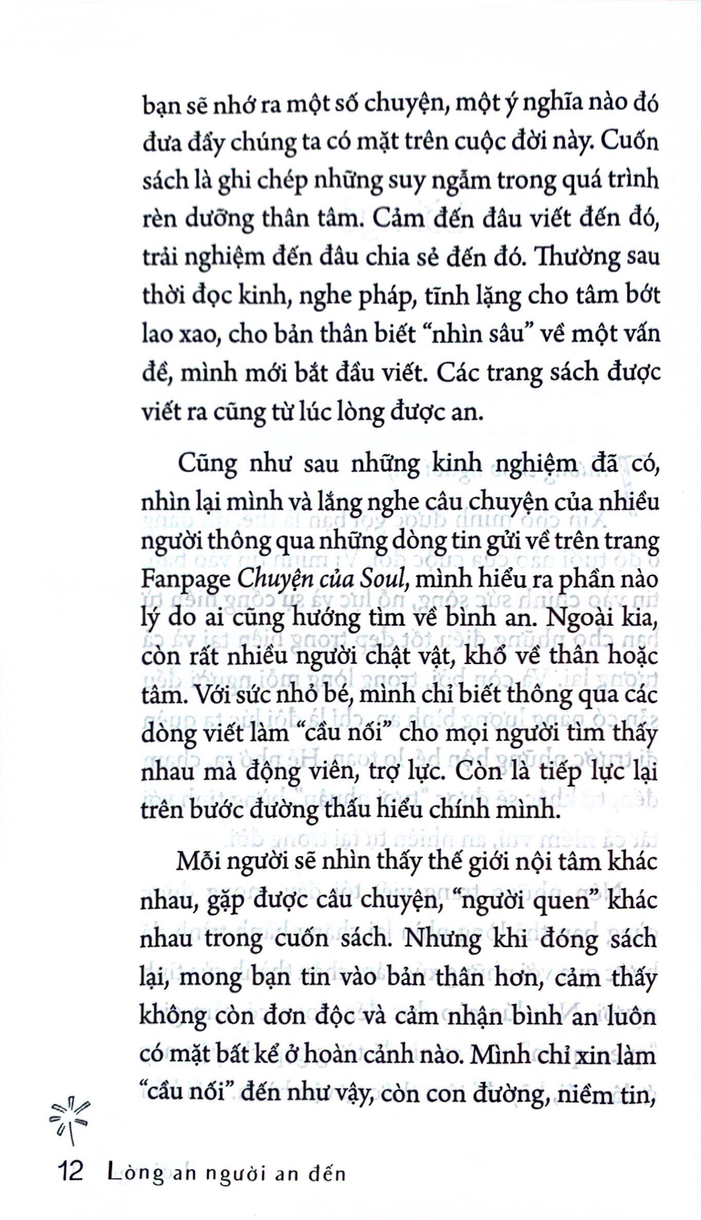 Lòng An - Người An Đến Nên những trang viết từ “Lòng an người an đến”, mong được cùng bạn thả lòng nhìn lại chặng hành trình đã bước qua với những xúc cảm chân thành của tình người. Nếu lúc nào đọc đến đoạn có cảm giác “quen quen” như m.ình đã từng gặp chuyện này ở đâu rồi, hãy để tâm thức tự vận hành. Rồi hẳn bạn sẽ nhớ ra một số chuyện, một ý nghĩa nào đó đưa đẩy chúng ta có mặt trên cuộc đời này. Cuốn sách là ghi chép những suy ngẫm trong quá trình rèn dưỡng thân tâm. Cảm đến đâu viết đến đó, trải nghiệm đến đâu chia sẻ đến đó. Thường sau thời đọc kinh, nghe pháp, tĩnh lặng cho tâm bớt lao xao, cho bản thân biết “nhìn sâu” về một vấn đề, m.ình mới bắt đầu viết. Các trang sách được viết ra cũng từ lúc lòng được an. Cũng như sau những kinh nghiệm đã có, nhìn lại m.ình và lắng nghe câu chuyện của nhiều người thông qua những dòng tin gửi về trên trang Fanpage Chuyện của Soul, m.ình hiểu ra phần nào lý do ai cũng hướng tìm về bình an. Ngoài kia, còn rất nhiều người chật vật, khổ về thân hoặc tâm. Với sức nhỏ bé, m.ình chỉ biết thông qua các dòng viết làm “cầu nối” cho mọi người tìm thấy nhau mà động viên, trợ lực. Đời sống tinh thần ra sao sẽ thu hút những con người tương tự tìm về, chân trời góc bể cũng gặp được nhau. Những ai càng “nhớ” và “chạm” sâu tới thế giới bên trong, họ càng ít có sự chiếm hữu, càng dần bao dung, từ ái và mong muốn được làm những việc có lợi ích thiết thực cho nhiều người. Vun trồng tinh thần đến đâu, bản lĩnh, an vui sẽ hiển hiện đến đó. Vui trong ý nghĩ, vui trong lòng, sẽ làm cho nét mặt trở nên vui theo, từ đó, tạo nên một trường năng lượng nhẹ nhàng. Gần thì người ở cạnh thấy dễ chịu, cảm mến mà đối đãi tử tế với chúng ta. Lan xa thì sẽ là “cầu nối” đưa những con người tốt lành đến ngày càng nhiều. Lòng an, người an nhất định sẽ đến! Nhẹ nhàng tốt, nhẹ nhàng thương! Nhẹ nhàng mỉm cười, nhẹ nhàng an! Nhẹ nhàng gặp gỡ, nhẹ nhàng chia xa. Người cần đi nhất định sẽ đi. Người cần đến nhất định sẽ đến! Đời này vẫn đẹp là vì, có một số đoạn duyên phải ngừng, số khác lại nảy nở. Tùy ngộ mà an, tùy duyên mà sống! Tác giả: Soul (Tánh Pháp) là một tác giả Việt, anh cũng là người sáng lập trang fanpage Chuyện của Soul trên ok. – Sách đã xuất bản: