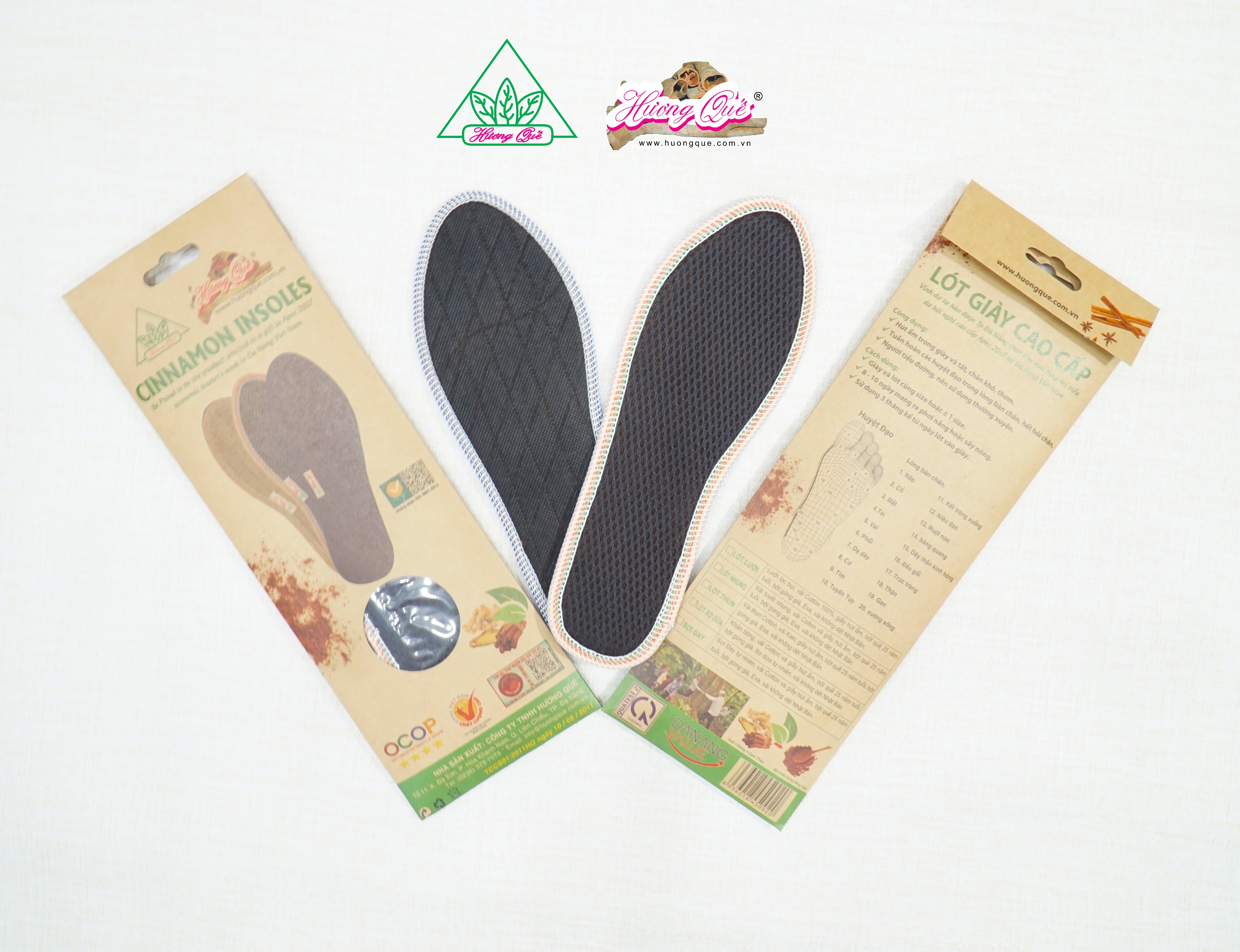 - Lót giày vải Hương Quế có thành phần từ cây Quế Trà My - Quảng Nam (là một trong bốn thảo dược quý Sâm - Nhung - Quế - Phụ) có chất lượng