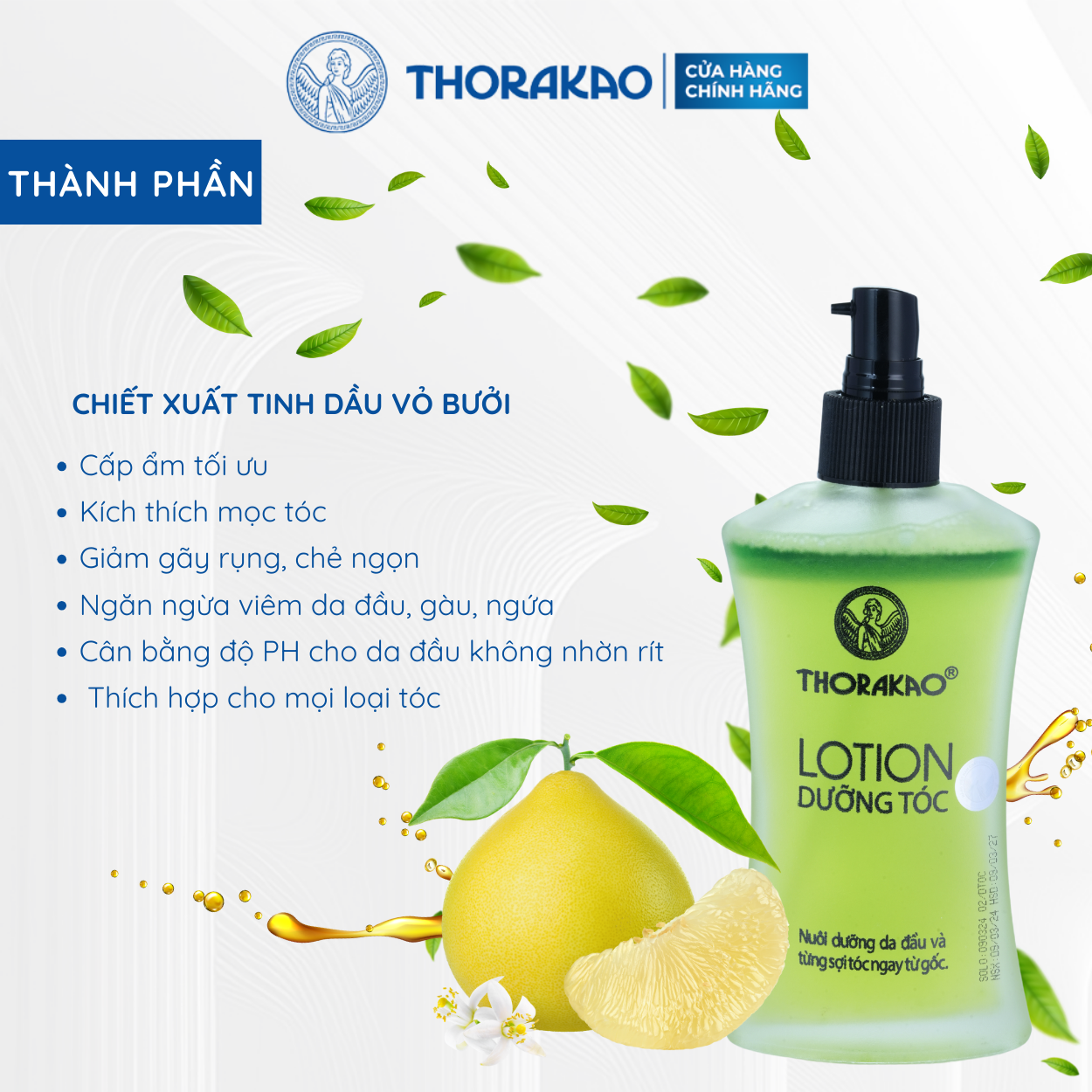 LOTION DƯỠNG TÓC TINH DẦU BƯỞI 120ML Kích Mọc Tóc Giúp Tóc Suôn Mượt Dạng Xịt   Với thành phần chiết xuất từ tinh dầu hoa bưởi thiên nhiên, sản phẩm cung cấp độ ẩm tối ưu, giảm gãy rụng, chẻ ngọn, và giúp tóc dễ dàng vào nếp. Đặc biệt, Lotion Thorakao còn bổ sung dưỡng chất cần thiết, hỗ trợ tái tạo tóc hư tổn do tác động từ môi trường hay hóa chất, mang lại mái tóc óng ả và đầy sức sống. THÀNH PHẦN SẢN PHẨM Tinh dầu chiết xuất từ vỏ quả bưởi : kích mọc tóc và ngăn ngừa rụng tóc hiệu quả. Với tính kháng khuẩn và chống viêm, tinh dầu vỏ cam đắng giúp làm sạch da đầu, ngăn ngừa các bệnh nhiễm khuẩn như nấm da đầu, gàu và viêm da tiết bã. Silanediol salicylate : giúp loại bỏ tế bào chết và làm sạch lỗ chân lông trên da đầu, giúp tóc dễ mọc và giảm nguy cơ tắc nghẽn nang tóc do dầu thừa và tế bào chết. ƯU ĐIỂM SẢN PHẨM Kích thích tuần hoàn máu ở da đầu, nuôi dưỡng nang tóc. Giảm tình trạng rụng tóc, giúp tóc mọc nhanh và dày hơn Ngừa gàu và các chất bẩn gây nấm da đầu. Bảo vệ da đầu, dưỡng tóc, giúp da đầu khỏe mạnh và tạo điều kiện tốt cho tóc phát triển.   ƯU ĐIỂM SẢN PHẨM Giữ cho da đầu mềm mại, mịn màng. Mùi thơm tinh dầu bưởi, lưu hương lâu cho tóc An toàn lành tính Cân bằng độ PH cho da đầu ĐỐI TƯỢNG SỬ DỤNG Sử dụng cho mọi loại tóc, đặc biệt là tóc dễ gãy rụng và da đầu nhờn.   HƯỚNG DẪN SỬ DỤNG Sau khi gội sạch tóc, sấy khô còn ẩm Xịt đều 2-3 phum lotion massage nhẹ nhàng da đầu trong 2-3 phút. Để tóc tự khô, và chải nhẹ tóc.   BẢO QUẢN Bảo quản nơi khô ráo, thoáng mát, tránh ánh nắng trực tiếp từ mặt trời. Để xa tầm tay trẻ em. Nếu có dấu hiệu đỏ, ngứa hoặc khó chịu, ngừng sử dụng và tham khảo ý kiến bác sĩ.   Cam kết 100% hàng chính hãng