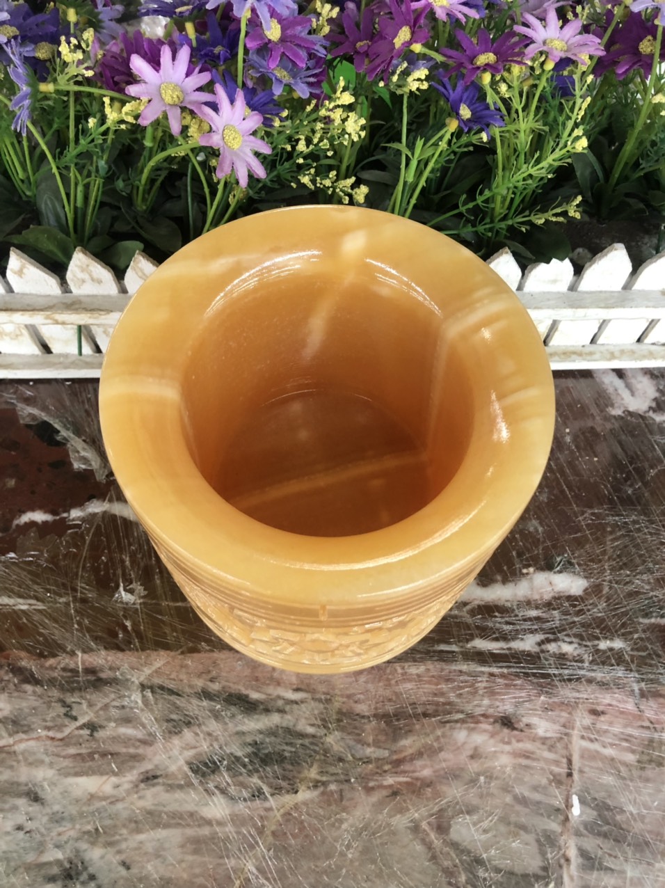Kích thước: Cao 20cm; Đường kính miệng 13cm; Ngang 20cm Khối lượng: 5 kg Chất liệu: Đá cẩm thạch trắng