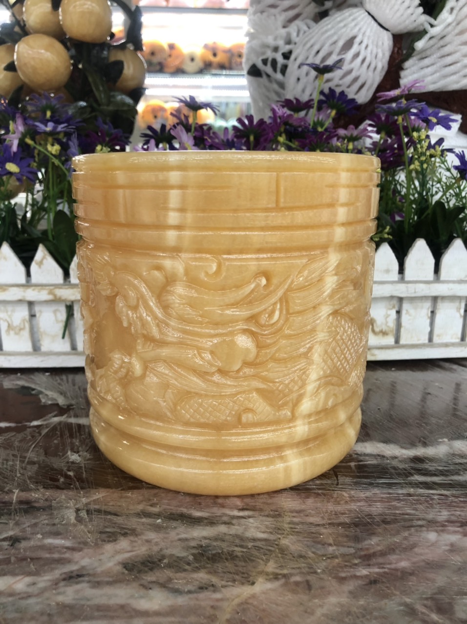 Kích thước: Cao 15cm; Đường kính 14cm Khối lượng: 3,5 kg Chất liệu: Đá ngọc hoàng long