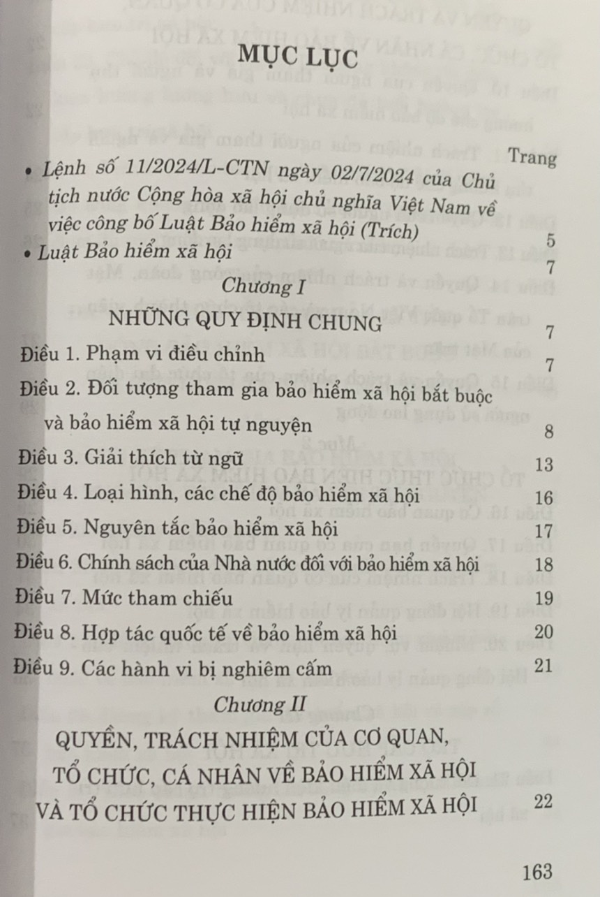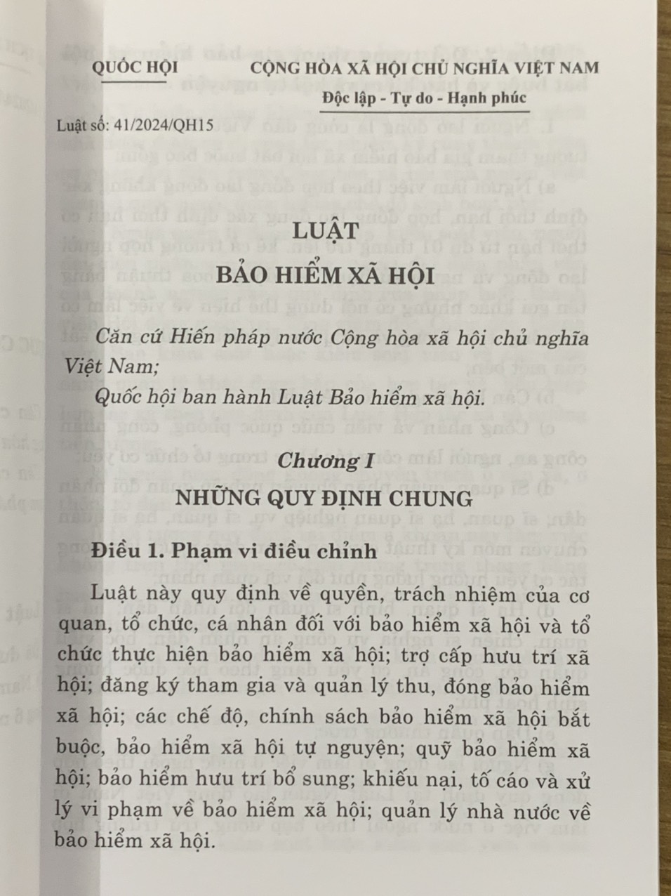 Luật Bảo hiểm xã hội năm 2024 NXB: Chính trị Quốc gia Sự thật Tác giả: Quốc Hội Ngày xuất bản: 7.2024 Khổ sách:13*19cm Công ty phát hành: NXB Chính trị Quốc gia Sự thật Hình thức bìa: Bìa mềm Giá bìa: 42.000 đ Lời giới thiệu: Luật Bảo hiểm xã hội đã được Quốc hội nước Cộng hòa xã hội chủ nghĩa Việt Nam khóa XV , kỳ họp thứ 7, thông qua ngày 29 tháng 6 năm 2024.