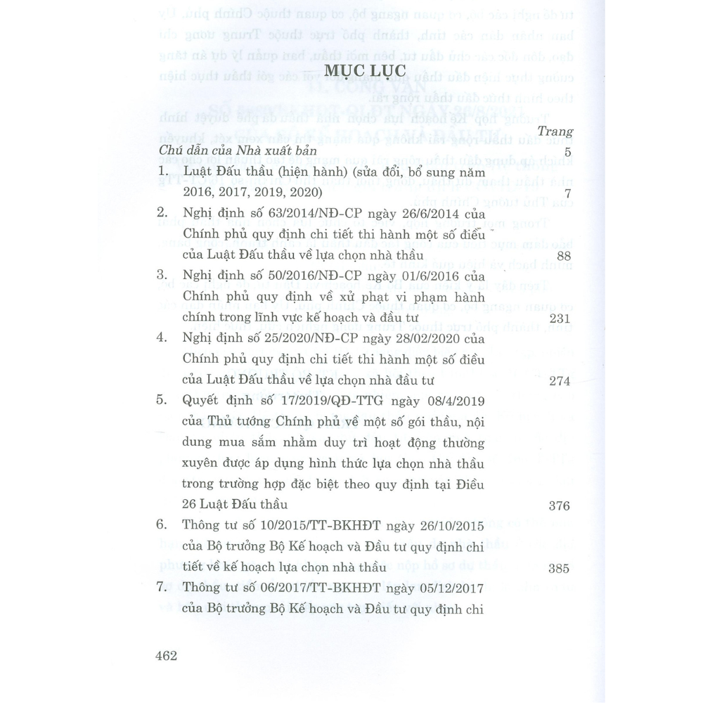 Nội dung cuốn sách bao gồm Luật Đấu thầu năm 2013 (sửa đổi năm 2016, 2017, 2019, 2020); các Nghị định của Chính phủ hướng dẫn chi tiết thi hành một số điều của Luật