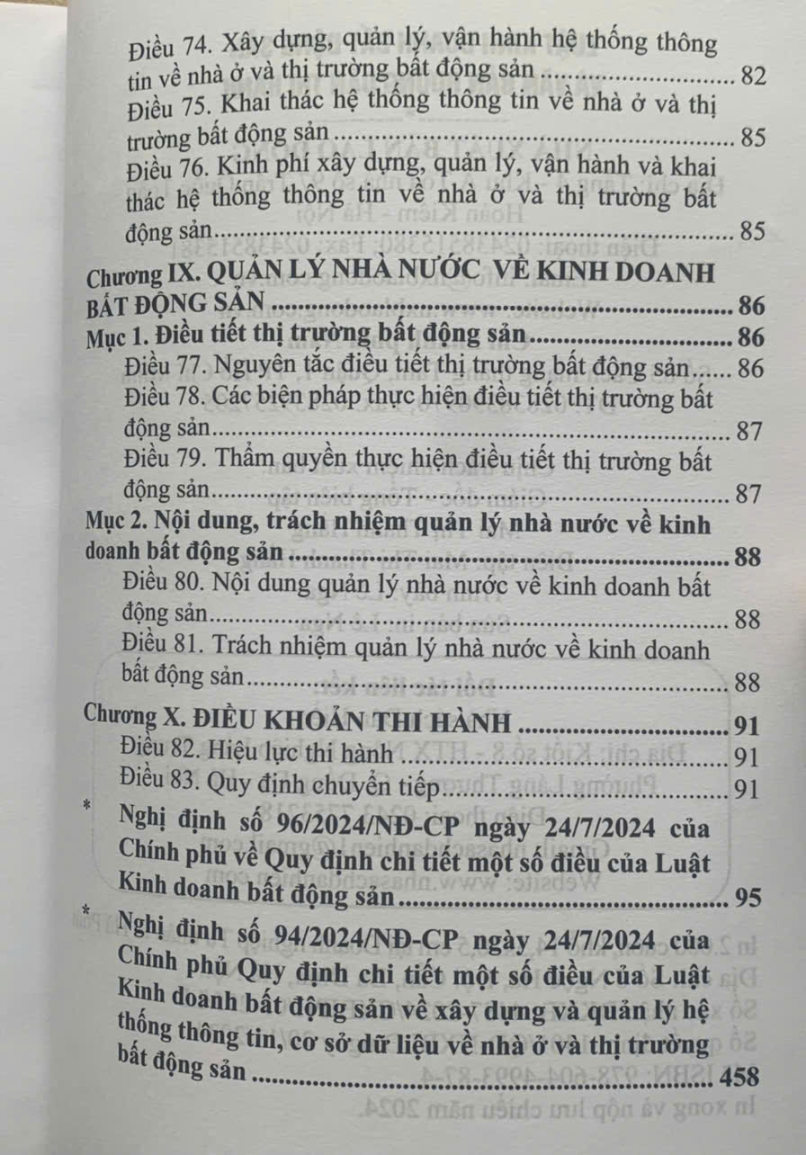 Sách Luật Kinh doanh bất động sản và văn bản hướng dẫn thi hành Tác giả: Quốc Hội Nhà xuất bản: Lao Động Công ty phát hành: Dân Hiền Ngày phát hành: 2.2025 Khổ sách: 14,5*20,5cm Số trang: 492 trang Hình thức bìa: bìa mềm Giá bìa: 180.000 đ Nội dung cuốn sách gồm 2 phần Phần 1: Luật Kinh doanh bất động sản Luật số 29/2023/QH15, có hiệu lực từ ngày 01/08/2024. Phần 2: Các nghị định Nghị định số 96/2024/NĐ-CP, ngày 24 tháng 7 năm 2024: QUY ĐỊNH CHI TIẾT MỘT SỐ ĐIỀU CỦA LUẬT KINH DOANH BẤT ĐỘNG SẢN Nghị định số 94/2024/NĐ-CP, ngày 24 tháng 7 năm 2024: QUY ĐỊNH CHI TIẾT MỘT SỐ ĐIỀU CỦA LUẬT KINH DOANH BẤT ĐỘNG SẢN VỀ XÂY DỰNG VÀ QUẢN LÝ HỆ THỐNG THÔNG TIN, CƠ SỞ DỮ LIỆU VỀ NHÀ Ở VÀ THỊ TRƯỜNG BẤT ĐỘNG SẢN