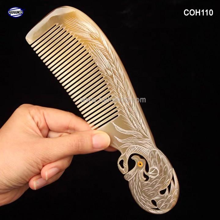 Đây là mẫu lược VIP được các nghệ nhân làm thủ công tạo hình con Phượng cuốn, được cắt khía vào thân lược kết hợp với những đường tỉa tách họa tiết sống động trên thân lược, chiếc lược dày dặn và làm bóng bảy rất kỹ.