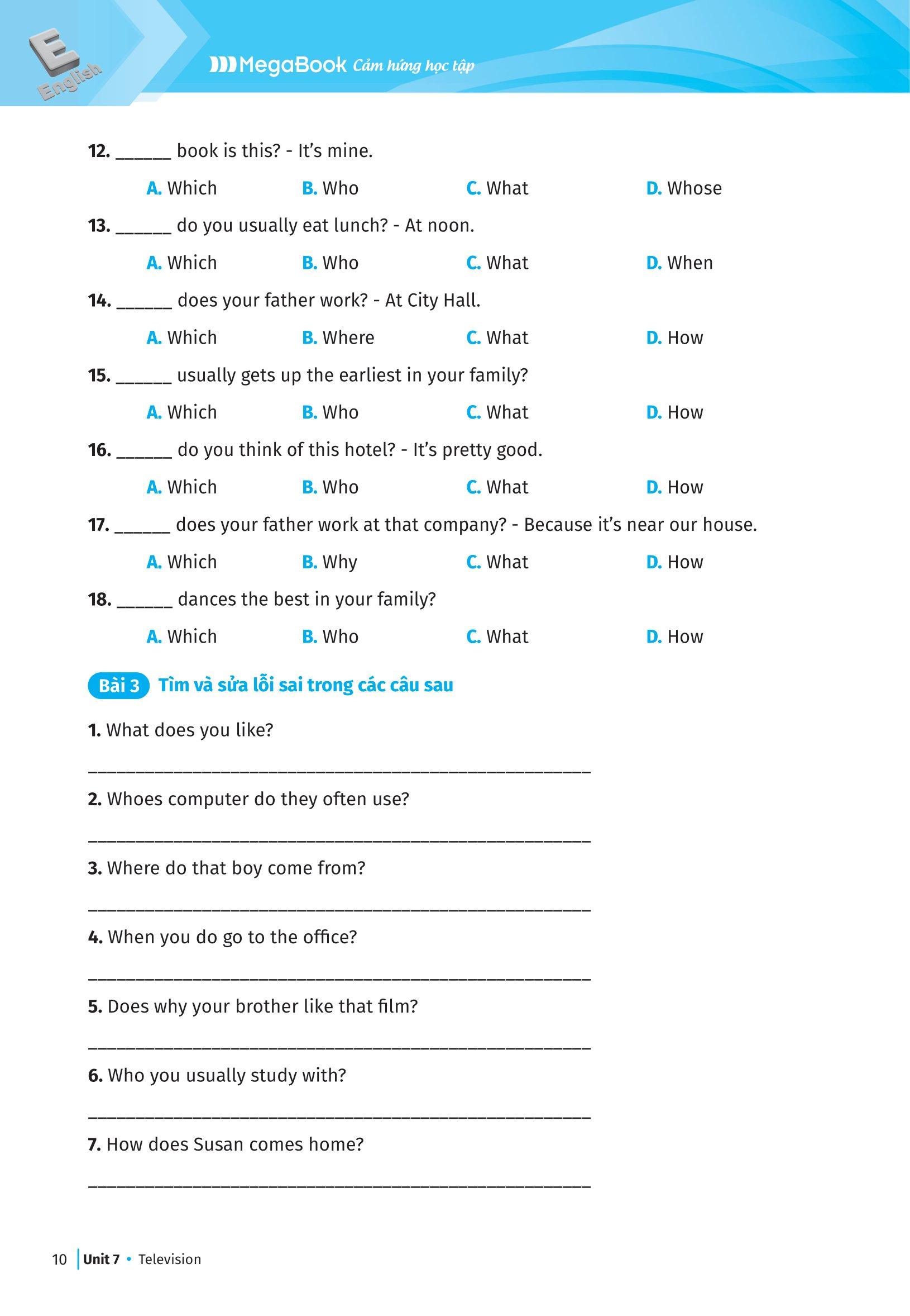 - Lời giải chi tiết Hệ thống lời giải chi tiết. Không chỉ được trình bày, giải thích một cách dễ hiểu, kĩ lưỡng, hệ thống lời giải chuyên sâu cũng được bổ sung và mở rộng giúp các em có thể tiếp thu nhiều kiến thức nâng cao và toàn diện hơn. Rất nhiều mẹo giải hay, dễ dàng vận dụng, dễ nhớ sẽ giúp các em làm bài nhanh hơn, đạt điểm cao hơn. Từ đó, các em sẽ tăng thêm niềm hứng thú với môn học này. Megabook hi vọng rằng Bộ sách “Luyện chuyên sâu Ngữ pháp và Bài tập tiếng Anh” sẽ luôn là người bạn đồng hành của các em học sinh và là sự tin tưởng hàng đầu của các thầy cô giáo và các quý phụ huynh!