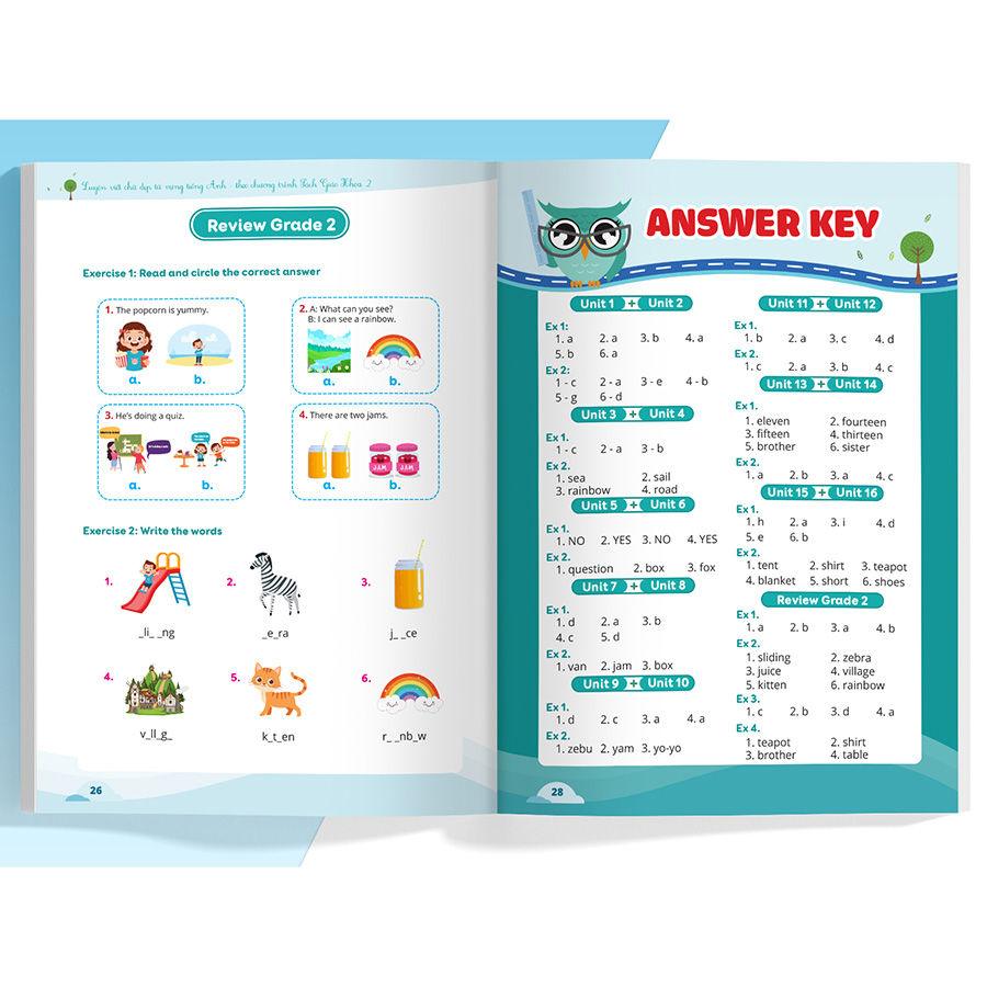 - Hệ thống từ vựng quen thuộc theo chương trình sách giáo khoa Các chủ đề, chủ điểm từ vựng trong sách cũng chính là các chủ để cơ bản và thường gặp với đời sống thường ngày. Bởi vậy, việc ghi nhớ bộ từ vựng này cũng sẽ giúp con tăng cường vốn từ vựng phong phú để ứng dụng trong giao tiếp hàng ngày. Kèm sau mỗi bài học là những hoạt động thực hành thú vị, các con vừa được ôn lại từ vựng hiệu quả, vừa được thoải mái thư giãn.