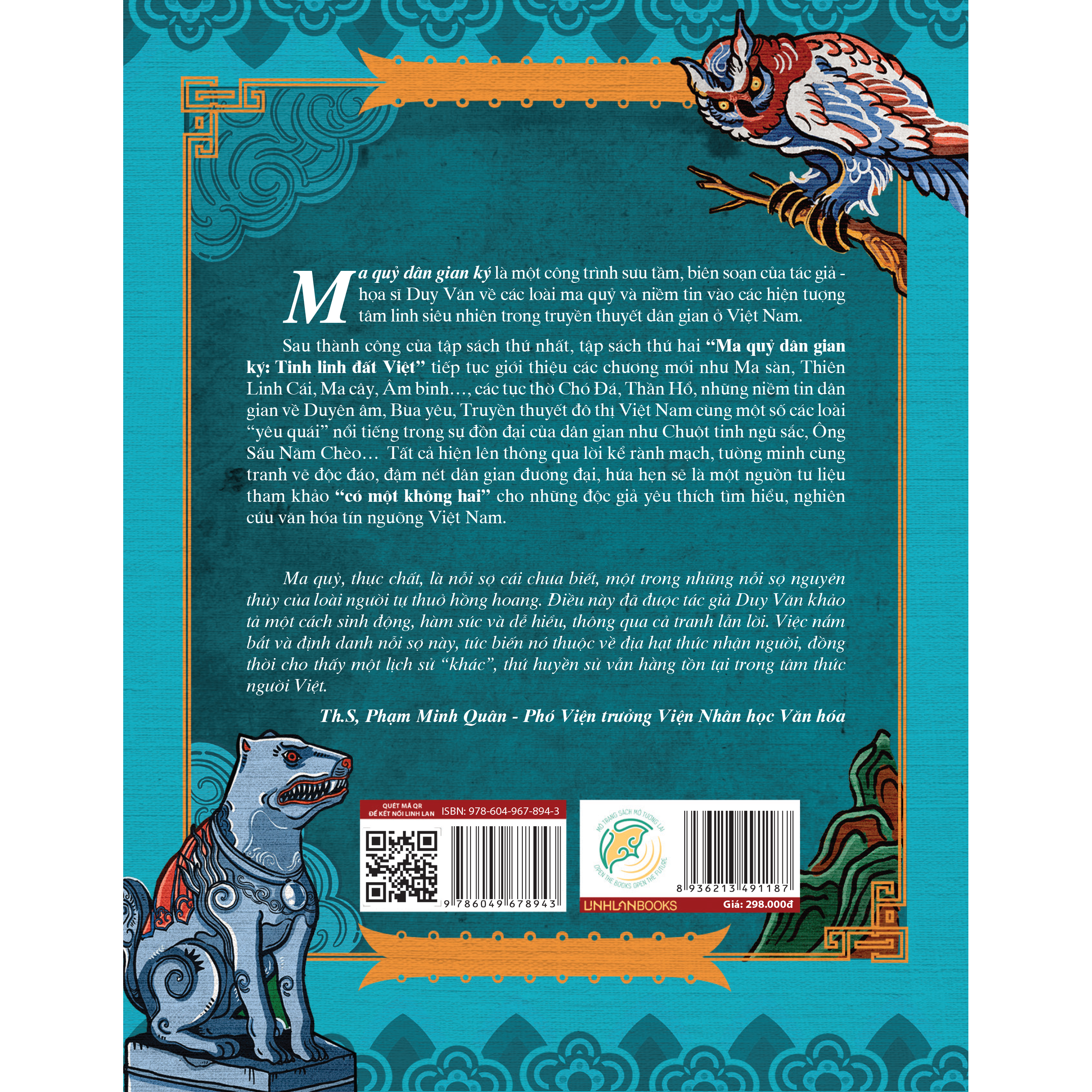 Sau thành công của tập sách thứ nhất, tập sách thứ hai “Ma quỷ dân gian ký: Tinh linh đất Việt” tiếp tục giới thiệu các chương mới như Ma sàn, Thiên Linh Cái, Ma cây, m , các tục thờ Chó Đá, Thần Hổ, những niềm tin dân gian về Duyên âm, Bùa yêu, Truyền thuyết đô thị Việt Nam cùng một số các loài “yêu quái” nổi tiếng trong sự đồn đại của dân gian như Chuột tinh ngũ sắc, Ông Sấu Năm Chè Tất cả hiện lên thông qua lời kể rành mạch, tường minh cùng tranh vẽ độc đáo, đậm nét dân gian đương đại, hứa hẹn sẽ là một nguồn tư liệu tham khảo “có một không hai” cho những độc giả yêu thích tìm hiểu, nghiên cứu văn hóa tín ngưỡng Việt Nam.