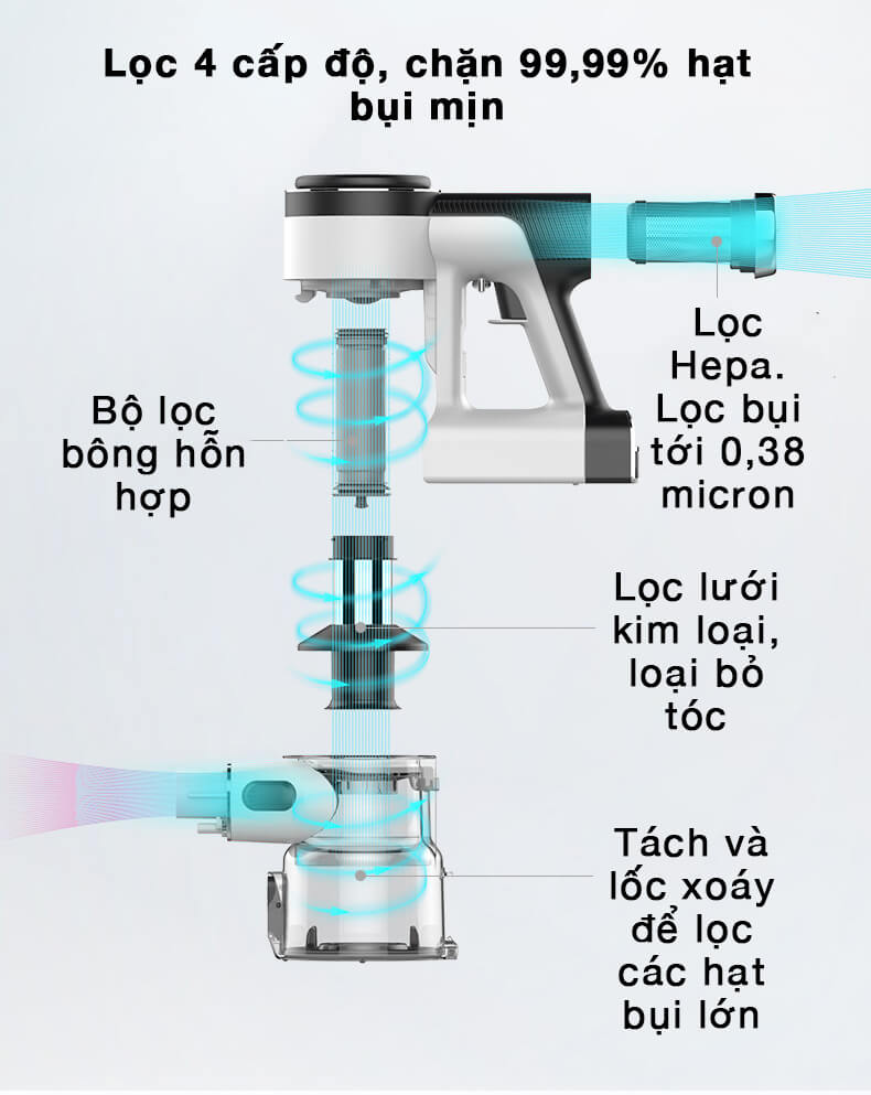 - Tự làm sạch lõi lọc bằng khí, tránh làm hỏng bông lọc của lõi đồng thời đảm bảo lực hút bền và mạnh hơn Công nghệ hút mạnh theo trục dọc Công nghệ hút mạnh theo chiều dọc của Tineco Pure one X1, cơn lốc do động cơ tạo ra được giải phóng theo chiều dọc, cải thiện hiệu quả, hiệu suất hút của động cơ và hoàn thành việc làm sạch sâu một cách hiệu quả, trong khi các máy hút bụi thông thường khác sẽ gây ra hiện tượng mất lực do hướng đi của lực hút xoay tròn và hiệu quả làm sạch không cao Lọc mịn gấp 4 lần, chặn 99,99% hạt bụi mịn