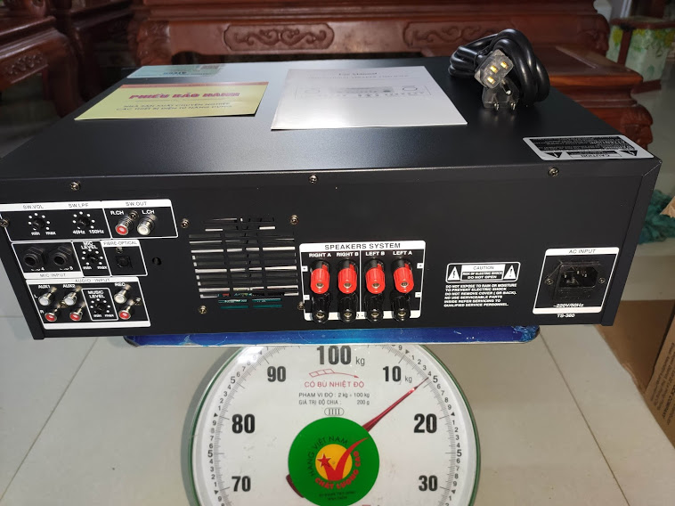 + Mặt sau của thiết bị là hệ thống các đường kết nối tín hiệu âm thanh vào và ra, các cổng kết nối thông dụng của thiết bị âm thanh và một số thông tin kỹ thuật cơ bản khác.